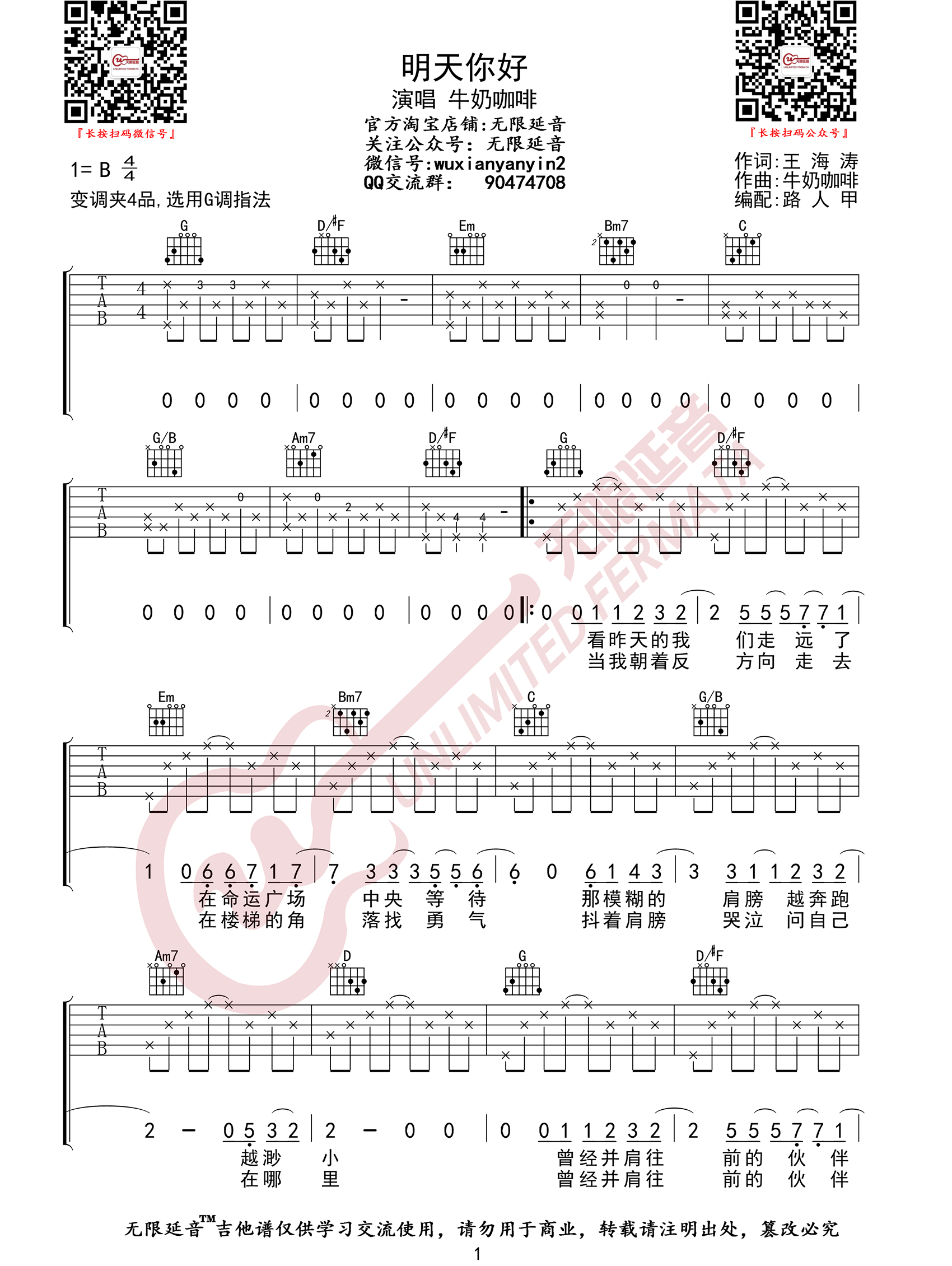 曲谱介绍: 吉他谱介绍:明天你好吉他谱,牛奶咖啡演唱的一首歌曲,4/4拍的节奏,这首歌曲的原调为B调,这里曲谱采用了G调指法进行编配,演唱时夹变调夹4品可回到原调,也可根据个人实际嗓音情况选择。曲谱由琴谱网更新上传,共3张高清图片弹唱吉他谱例,来源于@无限延音编配出品。这是一首励志歌曲,曲调柔美,略带感伤,希望这首歌能鼓励人们,鼓励人们对生活充满希望和向往,也希望现在的年轻人可以把每一天都看成新的,这样生活就会快乐起来。