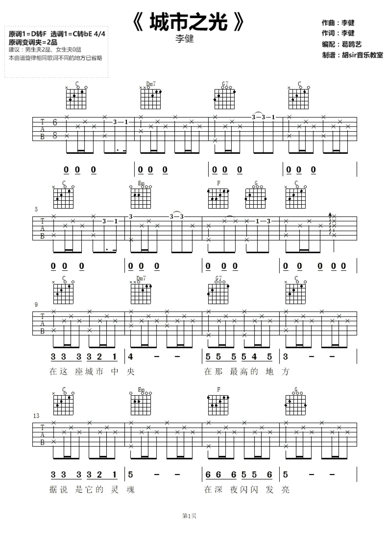 曲谱介绍: 李健为邓超电影《心理罪之城市之光》作的主题曲《城市之光》吉他谱发布,李健自带画面感的歌声很容易将听者带入到故事情节中,瞬间入戏。歌曲舒缓不乏高亢,歌声柔情又有力量,就像城市之光的宣传一样:万物皆有裂痕,那是阳光照进来的地方。谱子采用C转bE调,原调D转F,男生弹唱变调夹夹第二品,谱子上旋律相同歌词不同的地方做了省略,大家请注意。