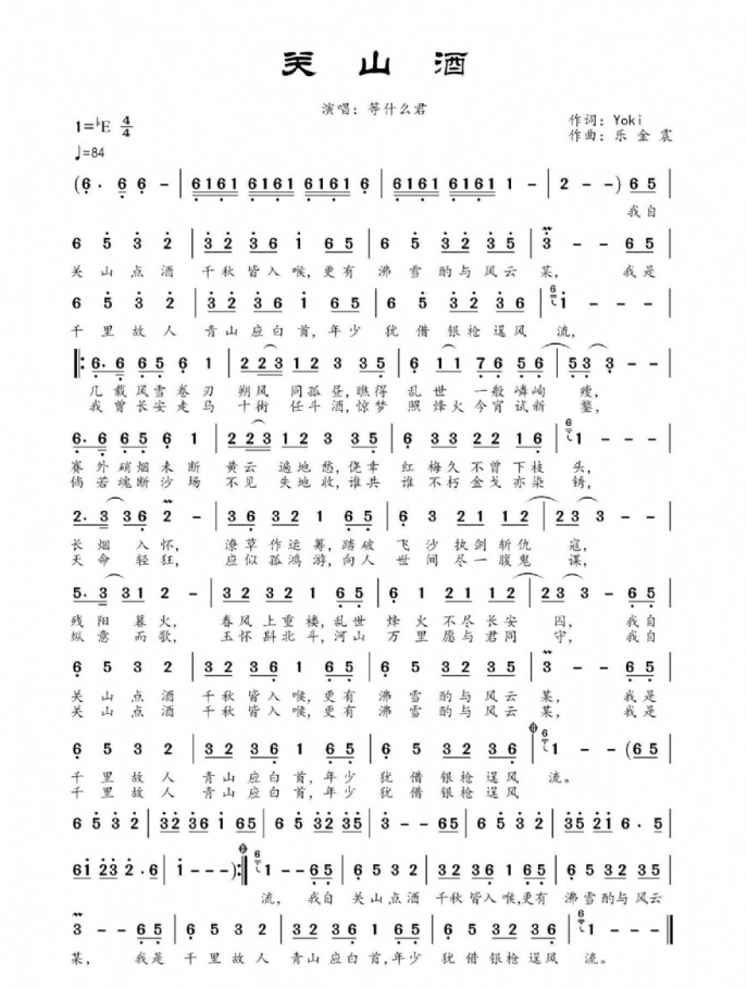 曲谱介绍:   关山酒是由小魂,痴笑演绎的歌曲。