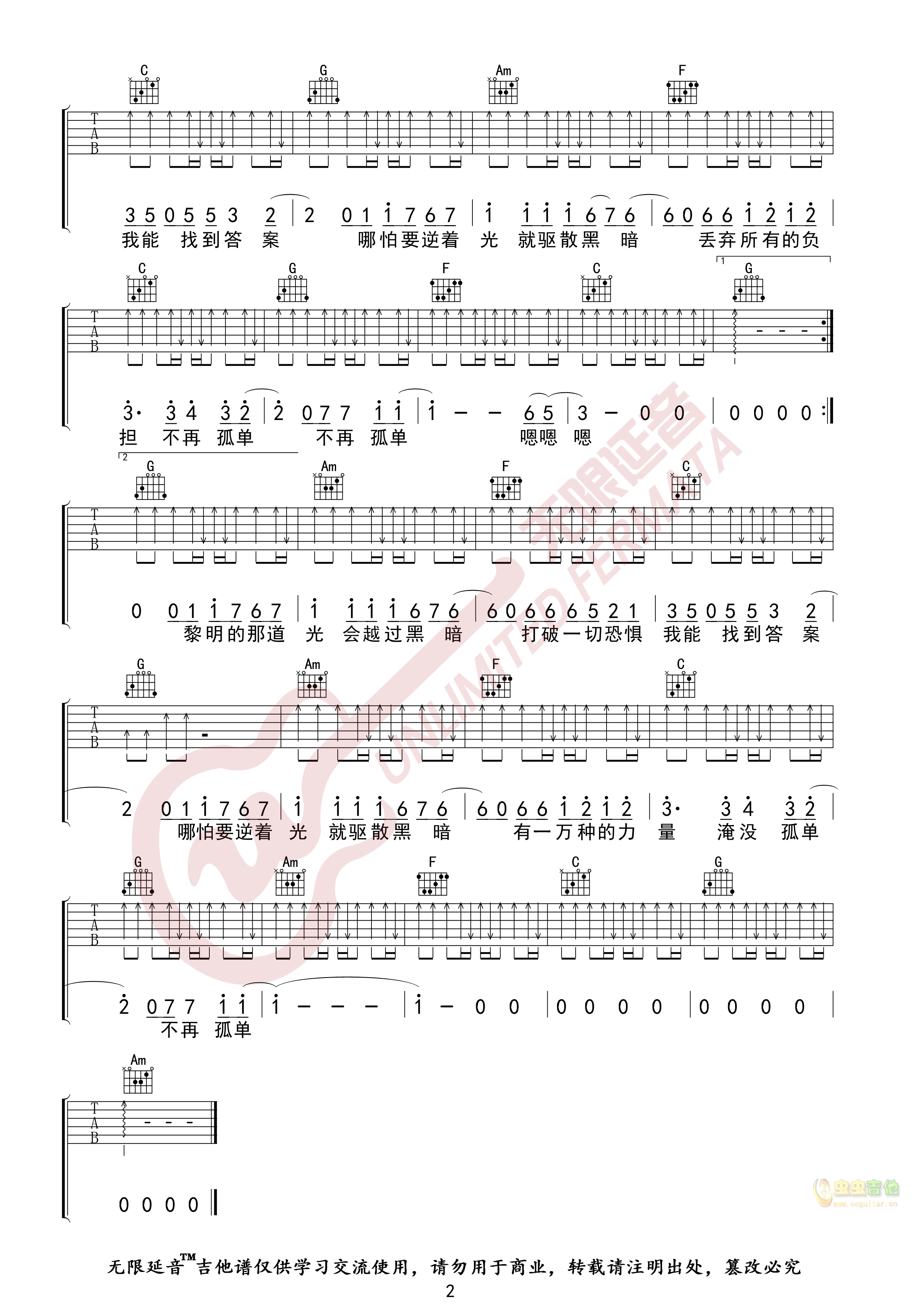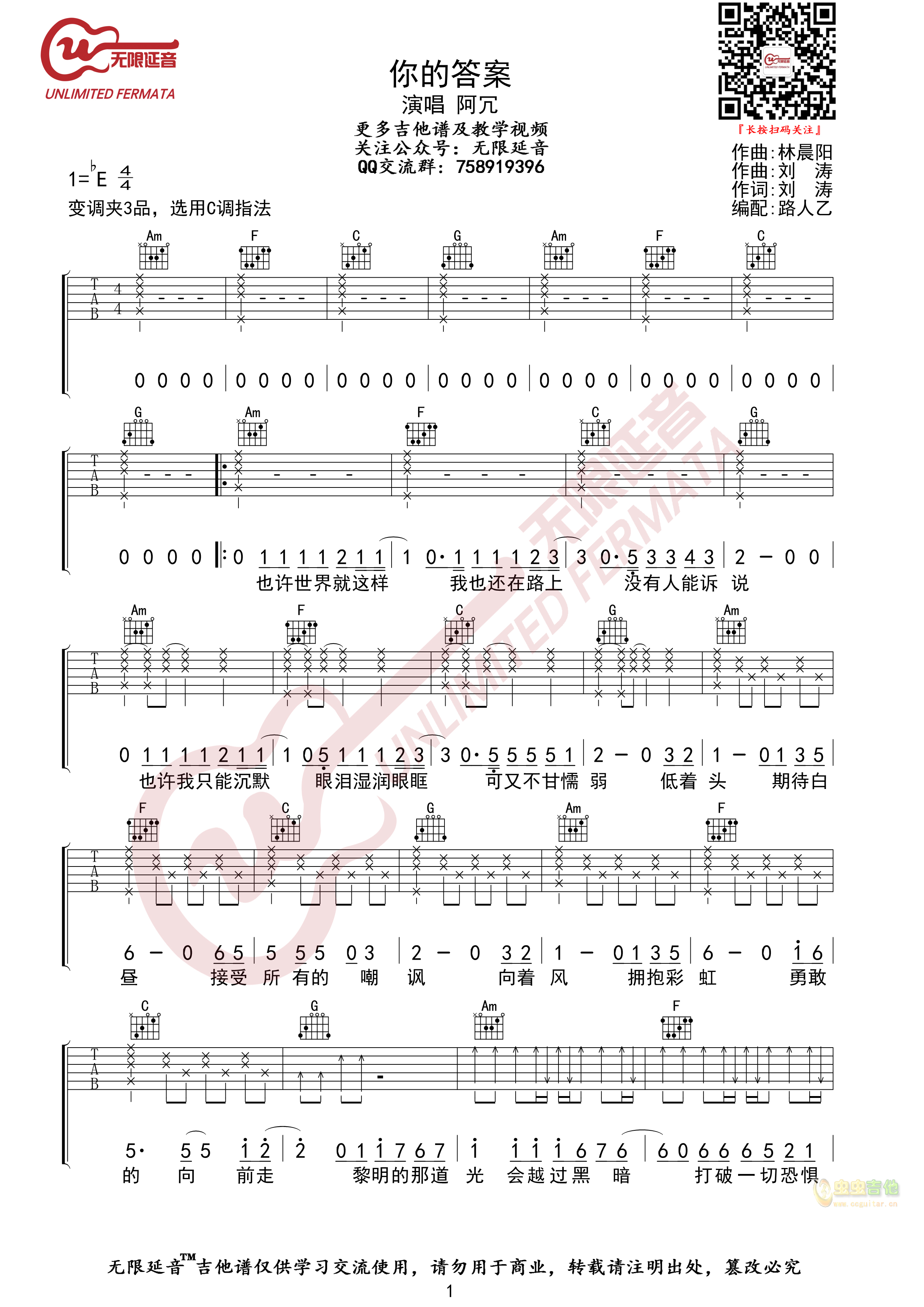 曲谱介绍: 《你的答案》吉他弹唱谱,共有2张高清图谱,免翻页排版设计。