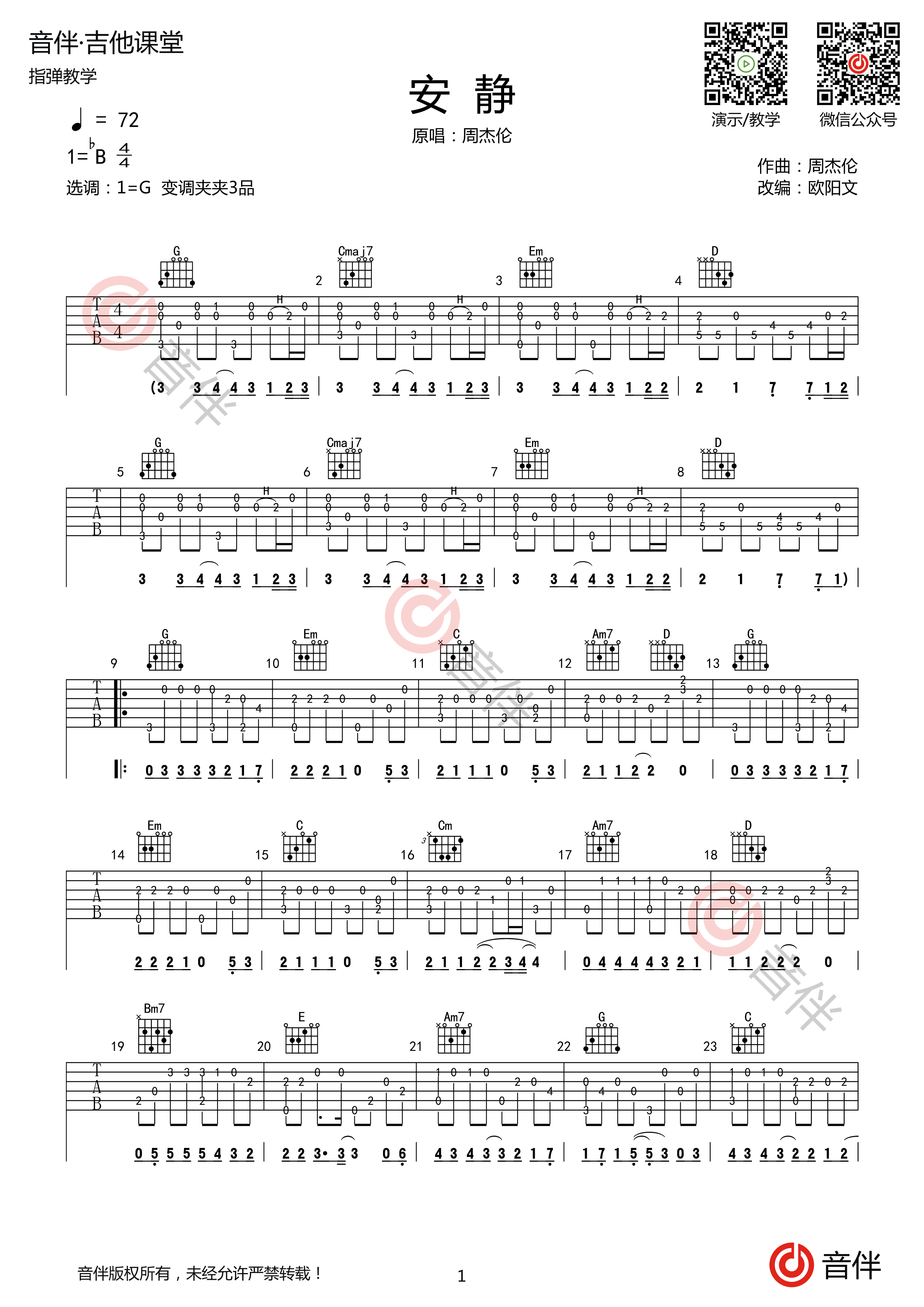 曲谱介绍: 周杰伦《周杰伦安静》吉他独奏谱,共有1张高清图谱,免翻页排版设计。