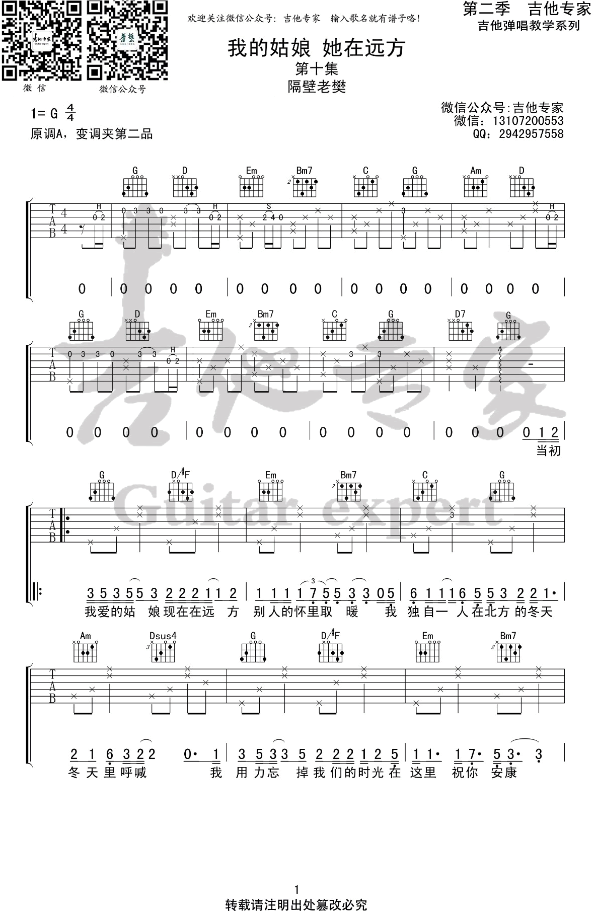 曲谱介绍: 《我的姑娘她在远方》吉他谱,隔壁老樊的一首新歌,原曲伴奏用的A调的指法,原版两把吉他完成的,这里选用G调指法编配在一起了,也不难,变调夹夹第二品。我的姑娘她在远方六线谱,三张弹唱图片谱,吉他专家编配分享,上传更新。 一首扎心情歌满是遗憾的故事,唱出对爱情的怀恋和最终的放下和祝福,让人感慨万千,但或许正是如此,我们才能真正成熟,并遇见下属于自己的爱情。 愿你的姑娘,已经来到面前。