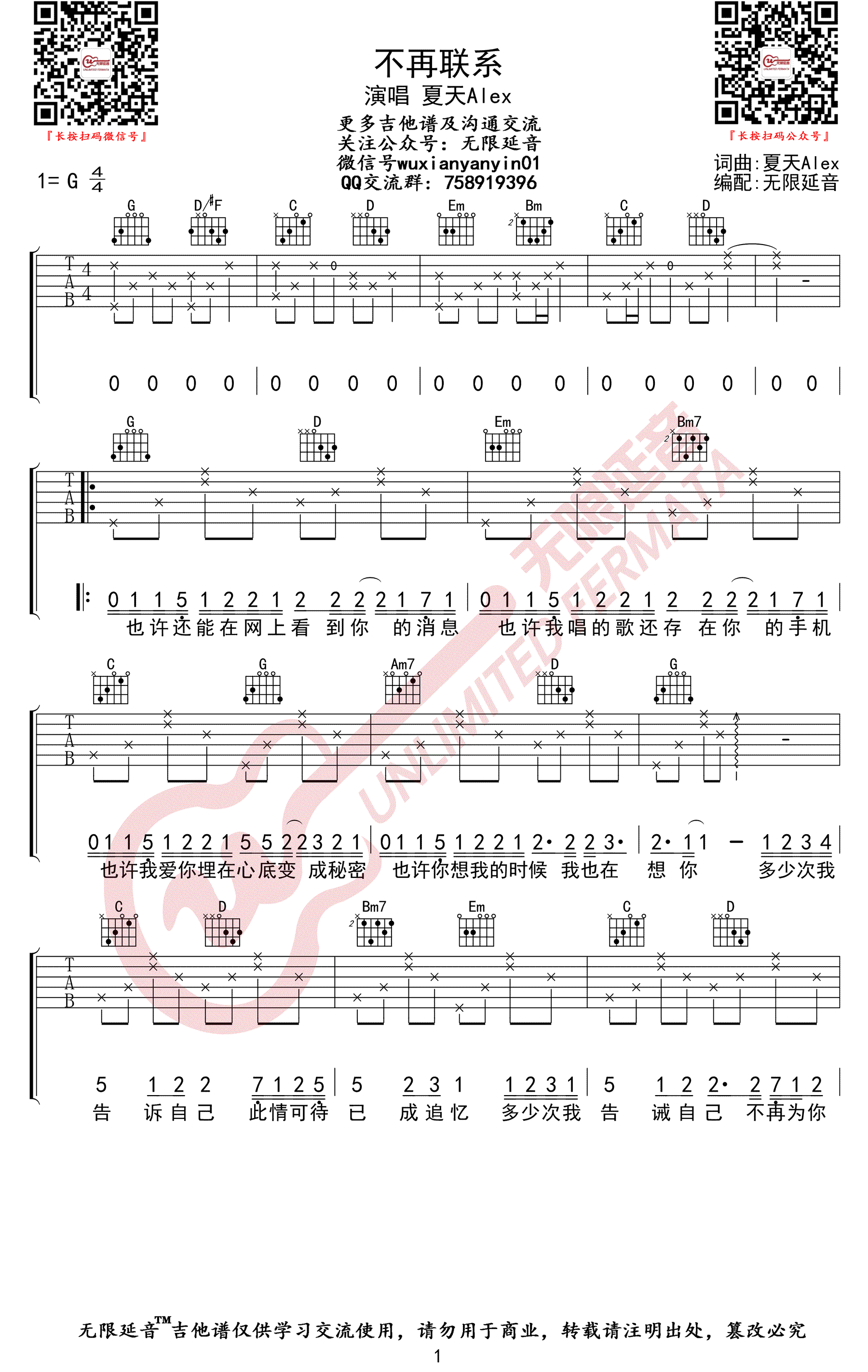 曲谱介绍: 《不再联系》吉他谱,夏天Alex演唱,一首让人单曲循环的感人情歌。不再联系六线谱,G调指法,两张高清图片谱,无限延音编配出品,吉他谱更新上传。