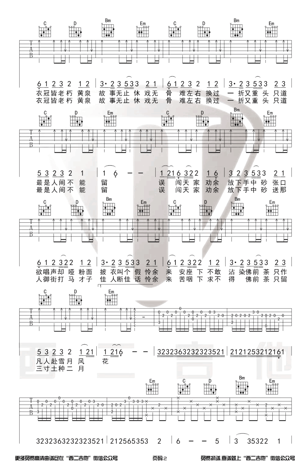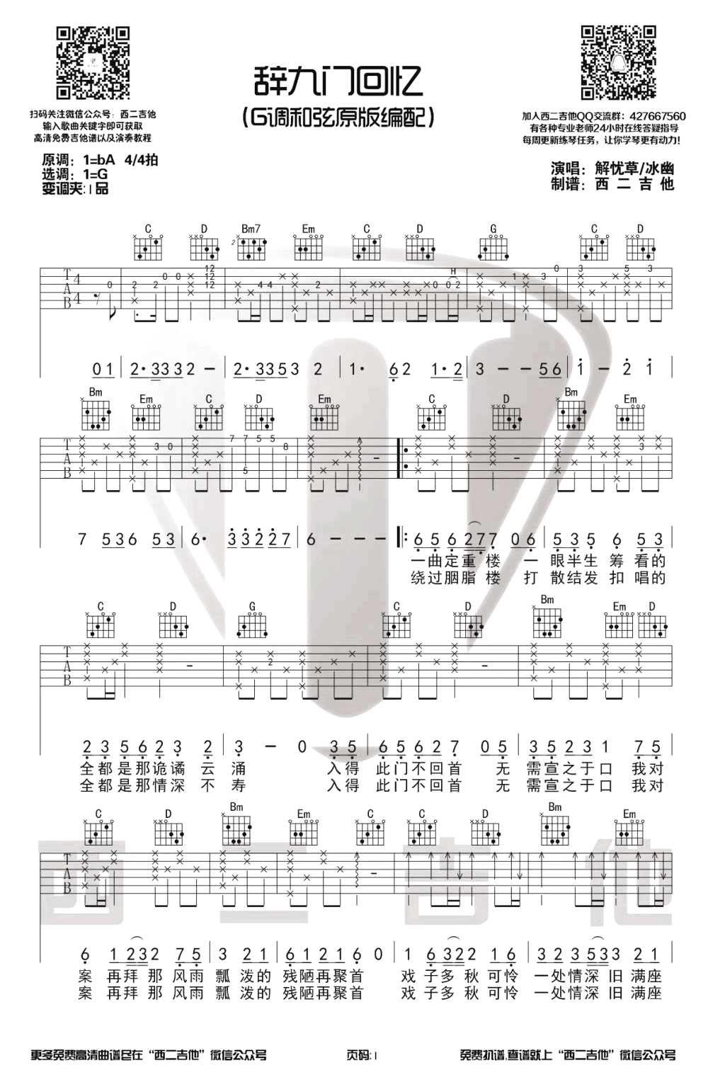 曲谱介绍: 《辞九门回忆》吉他谱,解忧草演唱的一首古风戏腔歌曲,辞九门回忆六线谱,原调bA,选调G和弦原版编配,变调夹夹一品。三张图片谱,西二吉他制谱出品,整理分享上传。