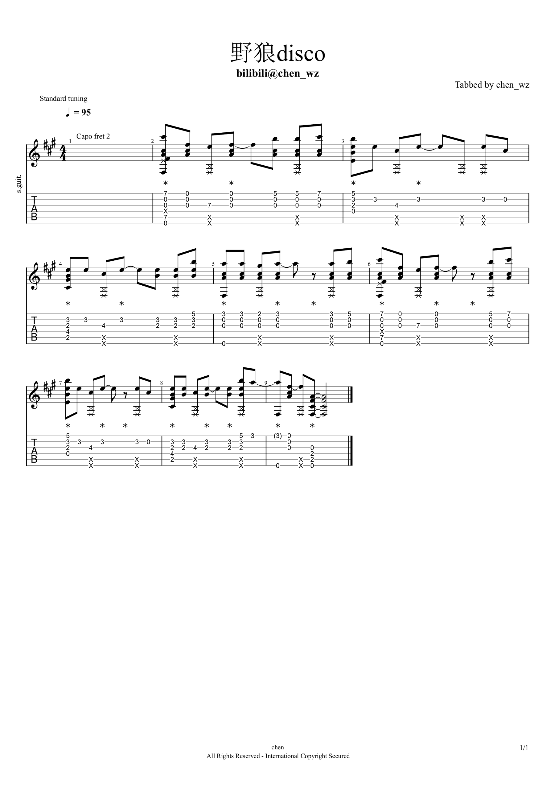 曲谱介绍: 野狼DISCO吉他谱指弹版,宝石gem(你的老舅)一首火遍网络的洗脑神曲,野狼disco吉他独奏谱,chen_wz改编制谱,上传更新。 无论你是否明白胸口如何画个郭富城,野狼disco这首歌,没人能逃得掉它的魔性摇摆,今天送上堪称年度最佳洗脑神曲的吉他独奏,随谱附上指弹视频,同时也直接把谱贴在视频里了,喜欢这首曲子的琴友们可以慢放学习。