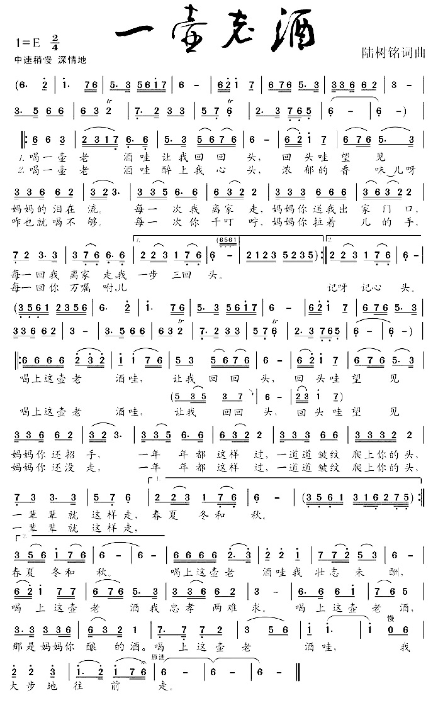 一壶老酒简谱 - 陆树铭