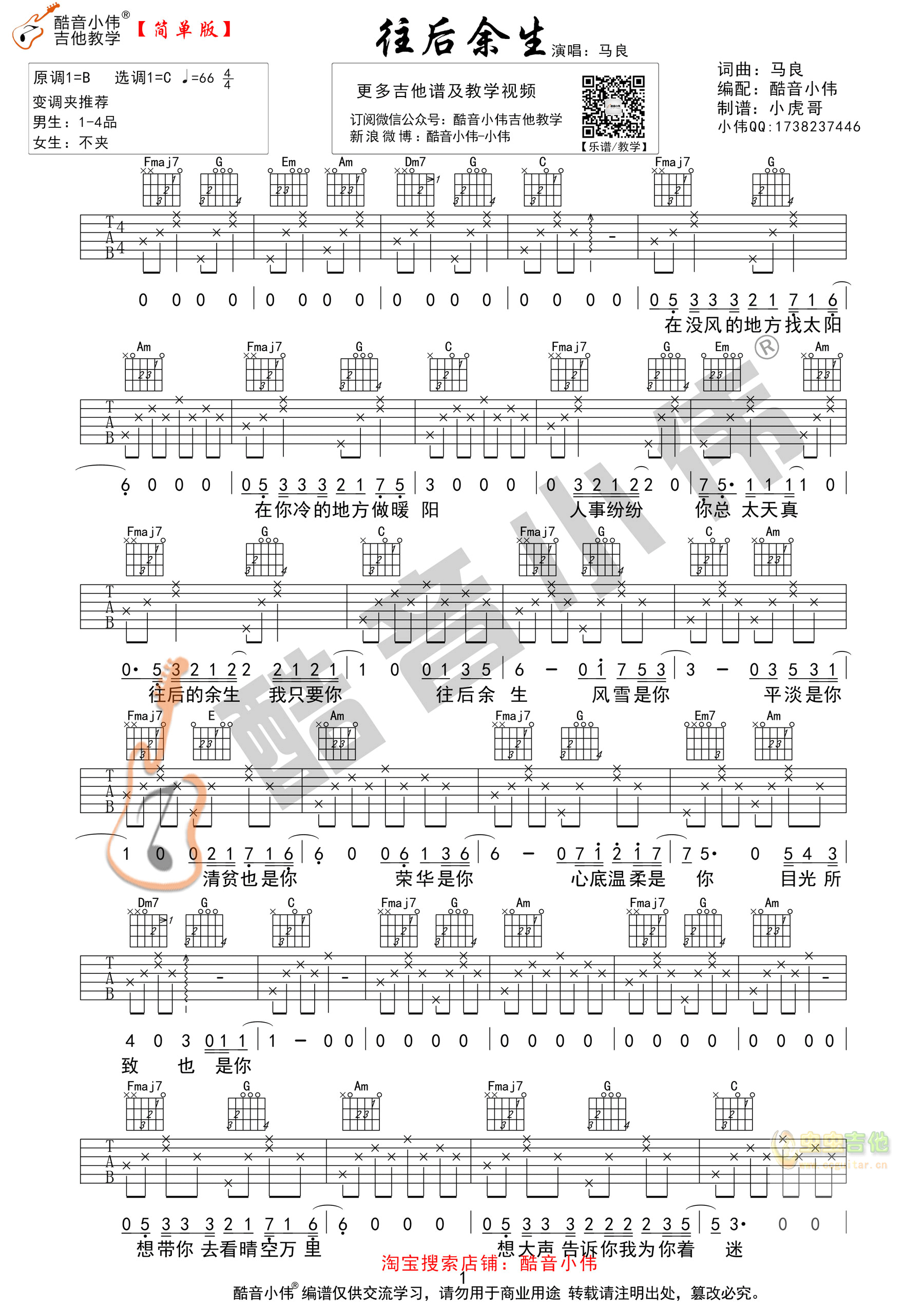 曲谱介绍:   《往后余生》是马良演唱的歌曲,由马良填词、谱曲,郭扬、周成编曲,于2018年5月16日发行。   2019年1月20日,该曲获第26届东方风云榜音乐盛典十大金曲奖。   2018年3月,默默无闻却还在坚持自己梦想的歌手马良,在抖音上传了自己翻唱歌曲的视频,不少网友支持他继续唱下去,并问他有没有原创作品。于是,他就在抖音上传了《往后余生》的副歌部分,网友们也鼓励他继续创作。在网友们的期待之下,他最终完善了整首歌曲。