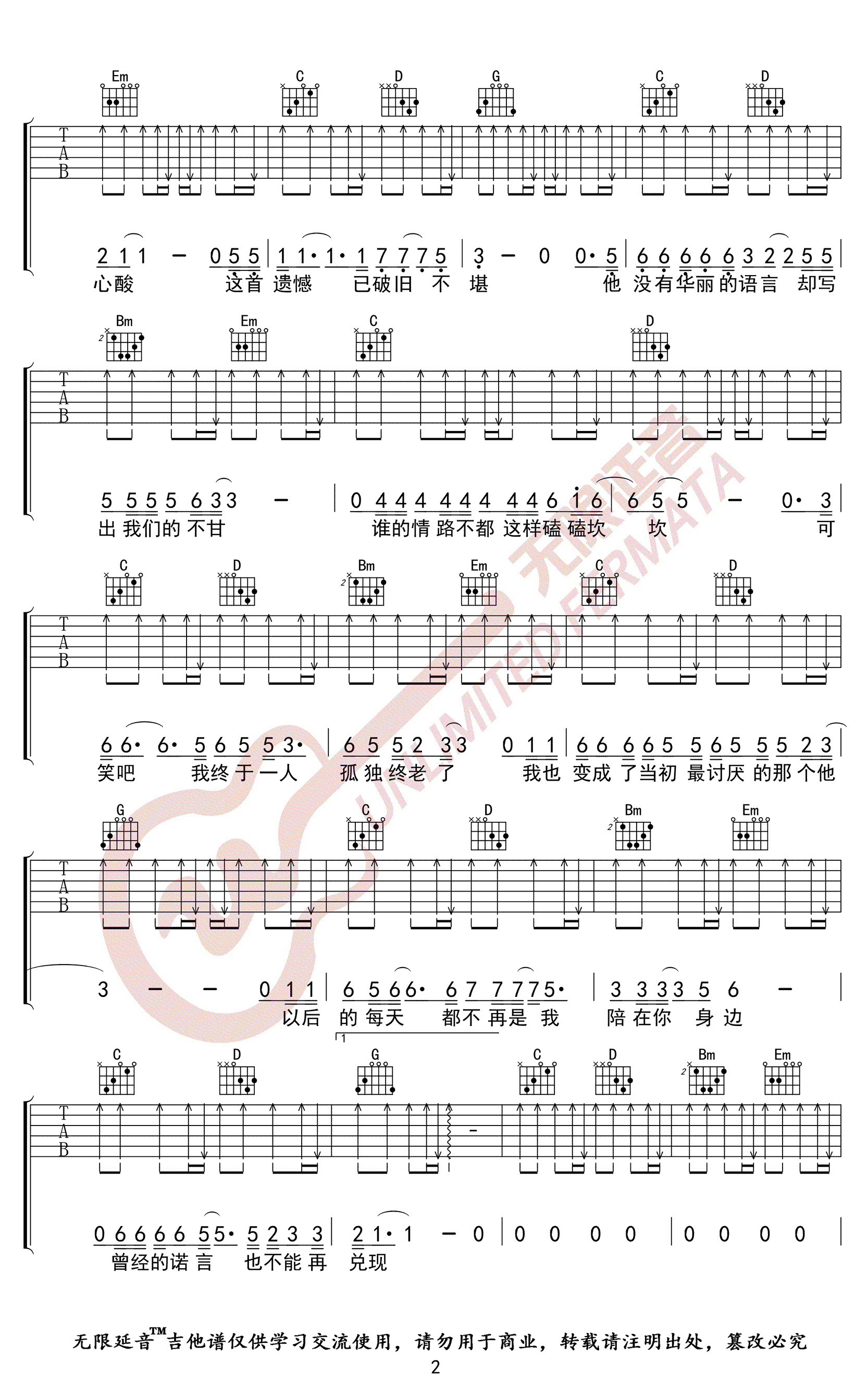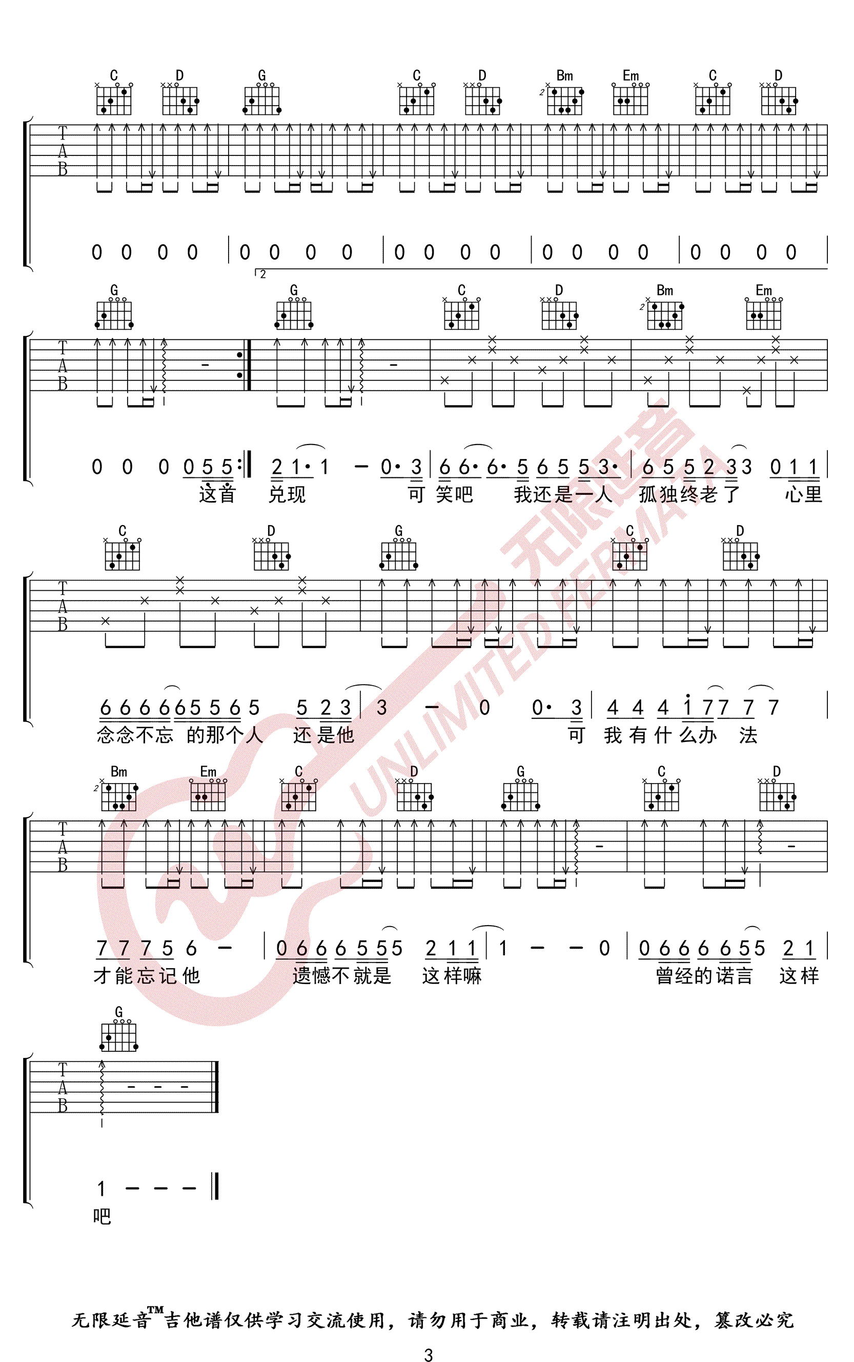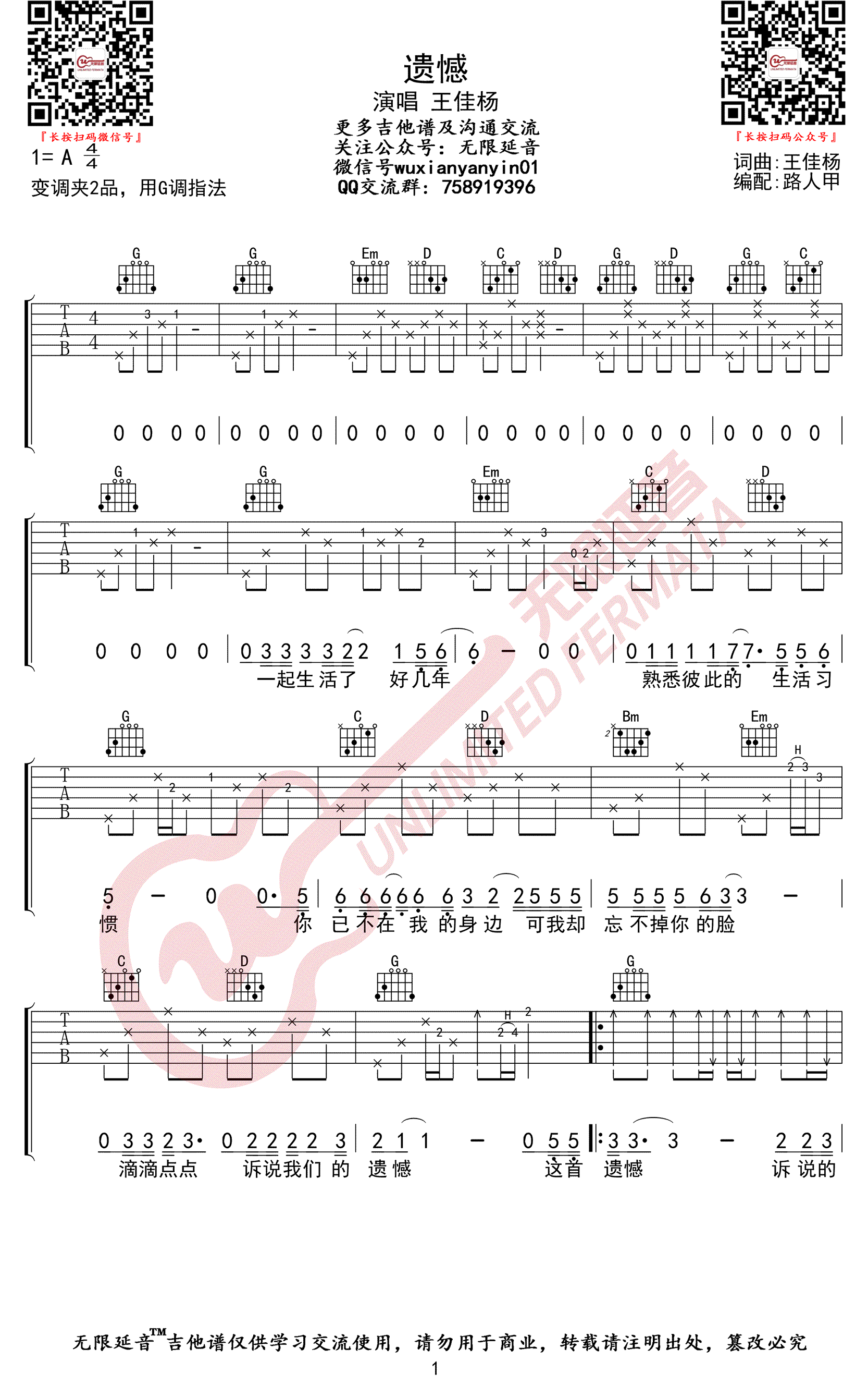 曲谱介绍: 《遗憾》吉他谱,是你大哥阿王佳杨原创的一首伤感情歌,遗憾六线谱,G调指法,变调夹夹第二品。完整版共三张高清图片谱,无限延音编配出品,上传分享。 快手音乐人是你大哥阿深情演唱的一首《遗憾》,动听的旋律感人的歌词,把人们在恋爱中倍感遗憾的心情展露出来,深沉的嗓音饱含真情的演唱令人动容