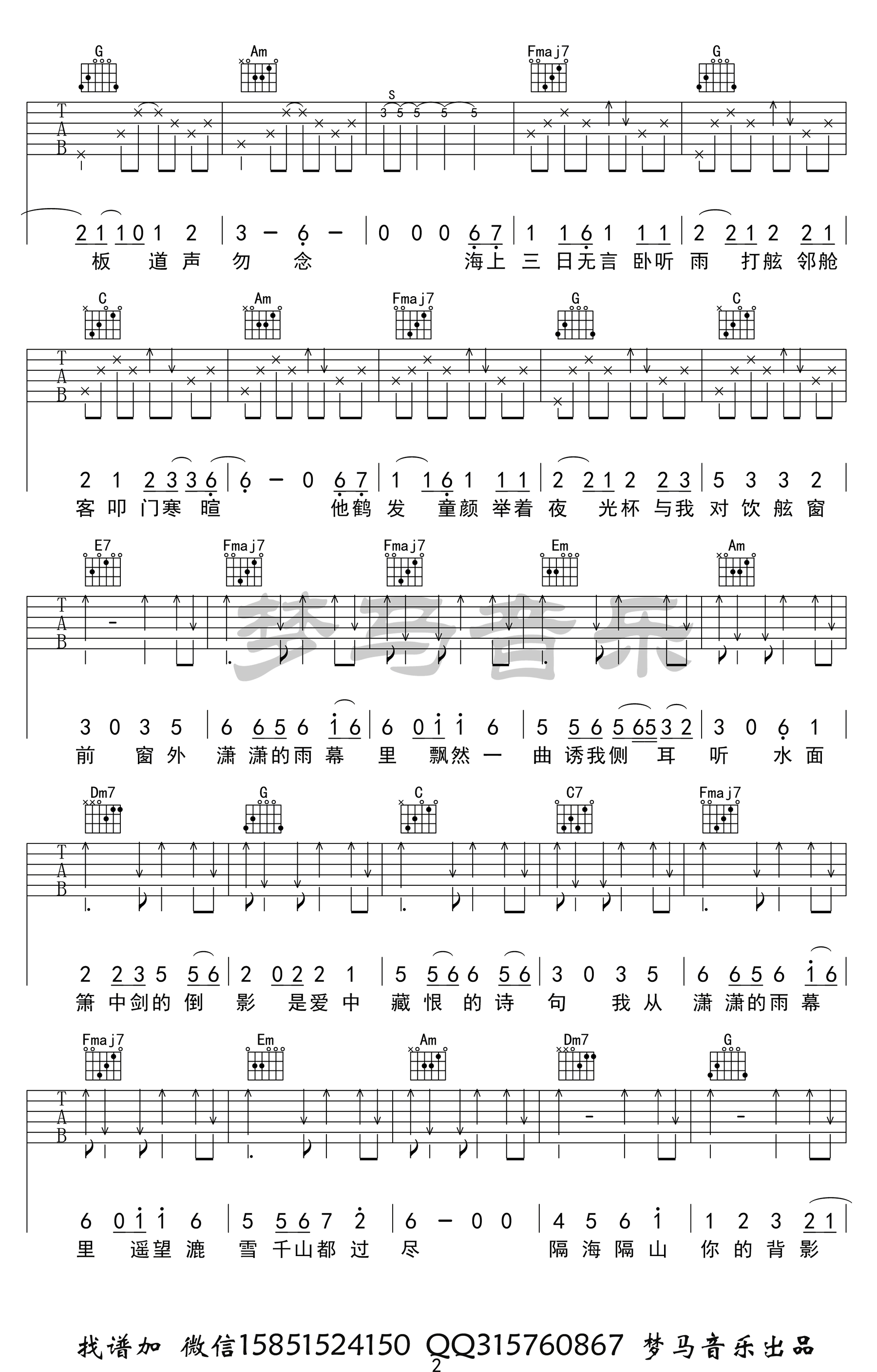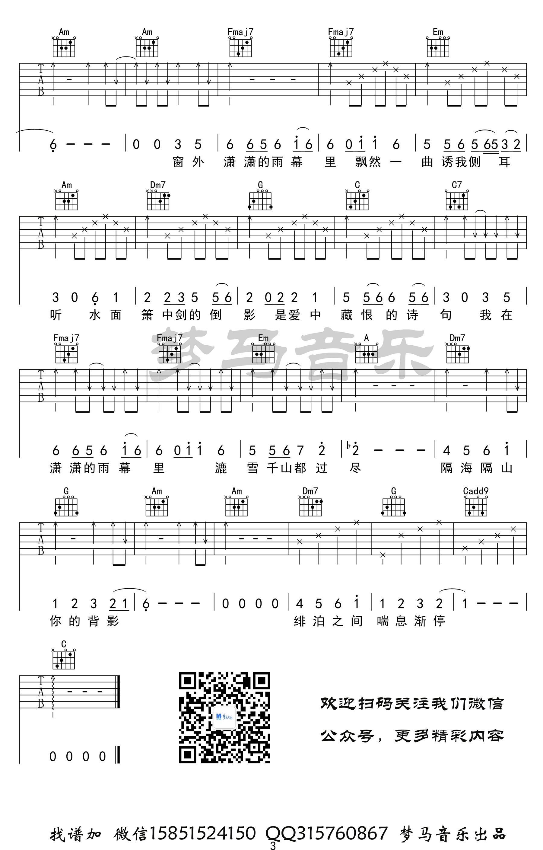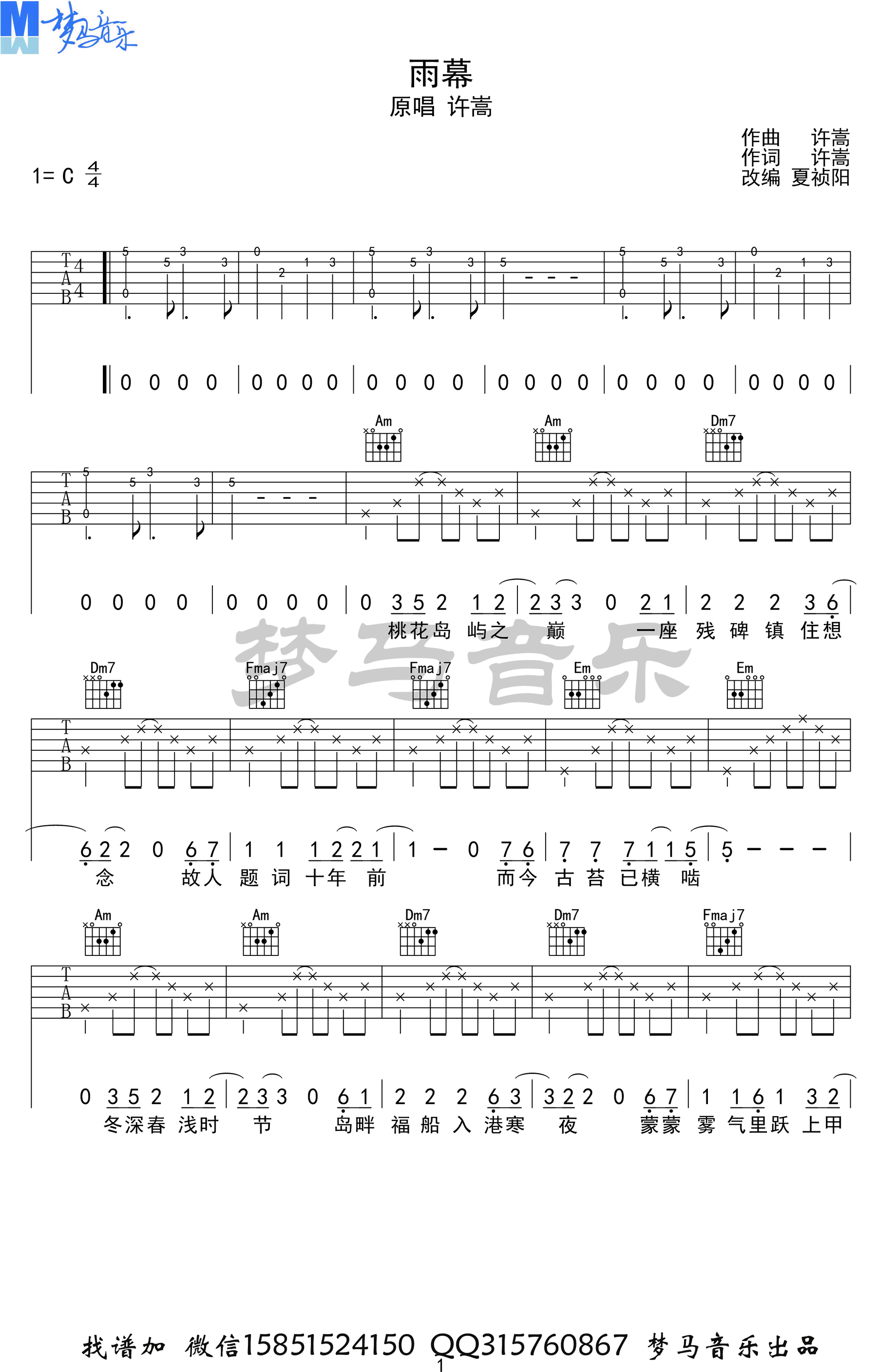 曲谱介绍: 《雨幕》吉他谱,许嵩词曲创作的一首新歌作品,雨幕六线谱,C调和弦编配,三张高清图片谱,梦马音乐制谱出品,随谱附上《雨幕》吉他弹唱演示视频,吉他谱上传分享。 夏祯阳老师编配说明:许嵩喜欢在旋律中用很多调式外的半音。可能他是想让人听到这个旋律会有耳目一新的感觉。而不是似曾相识的感觉。确实现在歌曲越来越多,但是旋律就那么多,听歌时候经常会有一种感觉,就是某两首歌的旋律或者感觉好像。不一定是抄袭,但是难免雷同。而我听不惯这些半音,所以我又把它改了回去。我主要改编的就是歌曲的副歌部分,旋律,和弦都有改变,并且加入了一些自己的理解。希望许嵩的粉丝能接受,不要骂我!