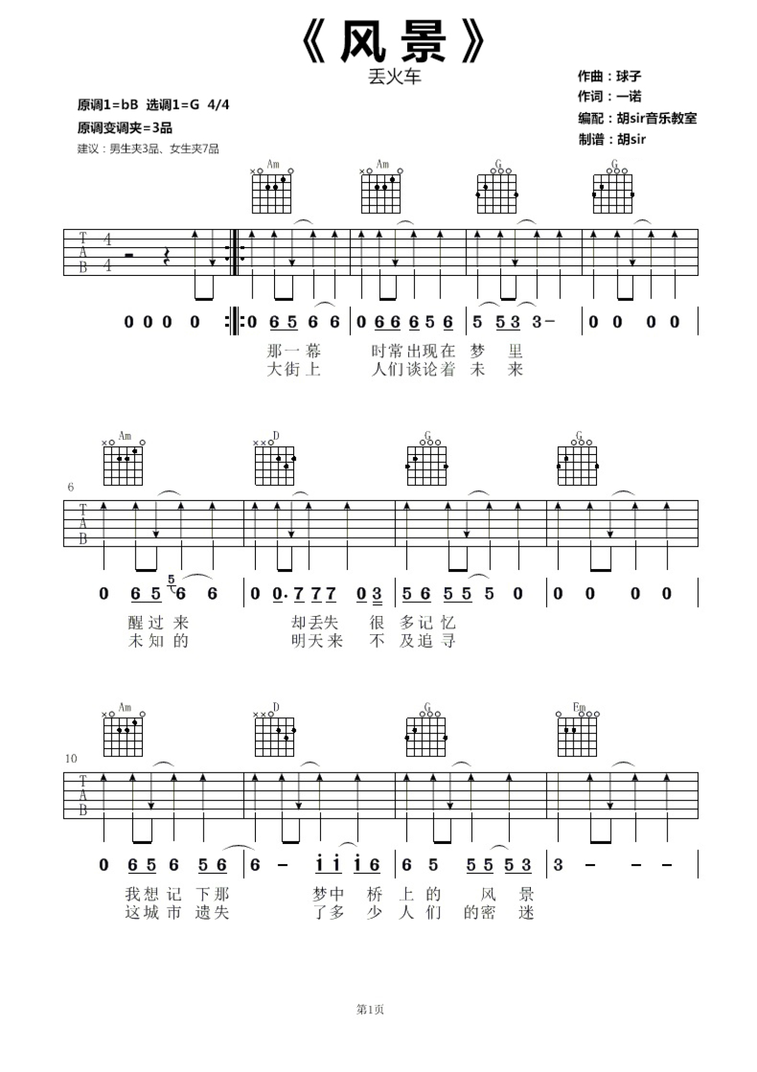 • 风景吉他谱 - 丢火车乐队 - G调吉他弹唱谱第1张