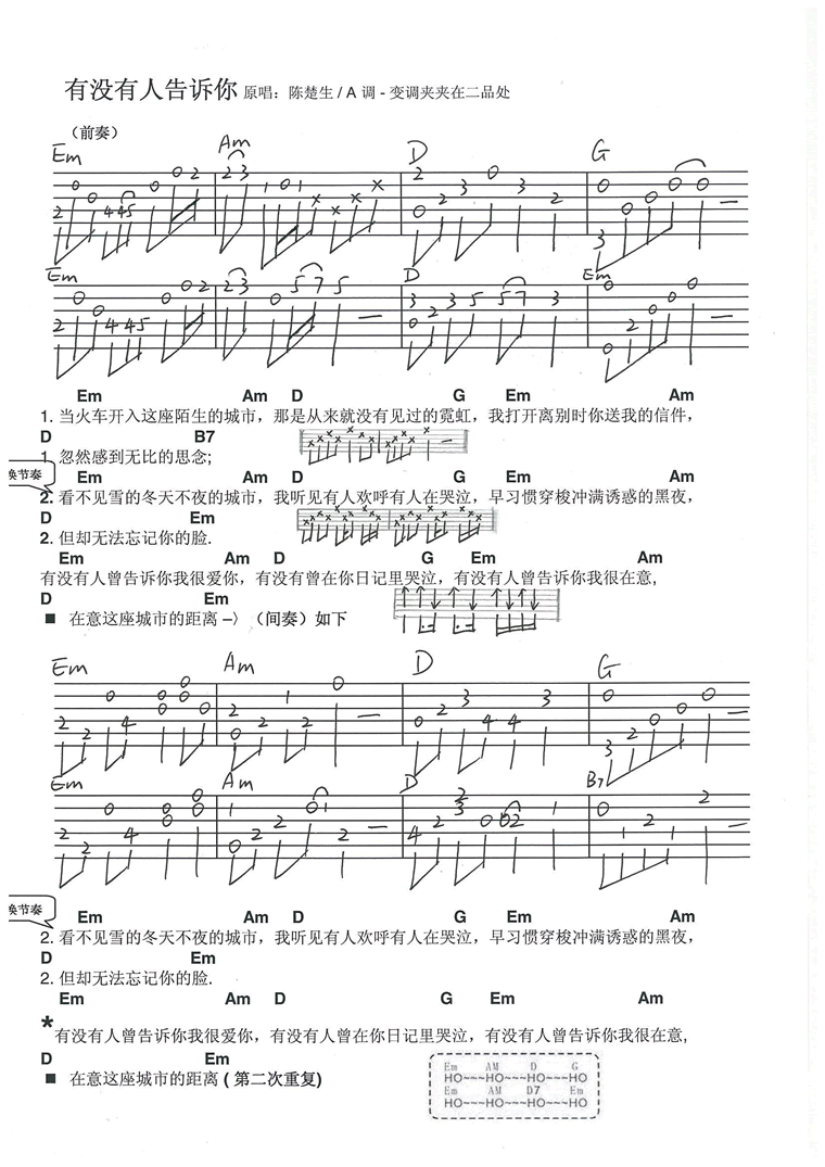 曲谱介绍:   《有没有人告诉你》是由陈楚生作词作曲并演唱的一首歌,收录在陈楚生2007年发行的专辑《原来我一直都不孤单》中。这首歌曾获得第八届音乐风云榜年度最佳歌曲奖和中国广播影视原创歌曲大奖最佳金曲提名奖等奖项。   2005年,陈楚生与EMI百代唱片公司解约不久在深圳酒吧继续做跑场歌手,   他本人又刚失恋,正赶上哥哥发生车祸受伤,他回海南看望之后回到深圳创作了这首歌,这首歌创作出来后,他经过不断地修改,特别是歌词方面精益求精。