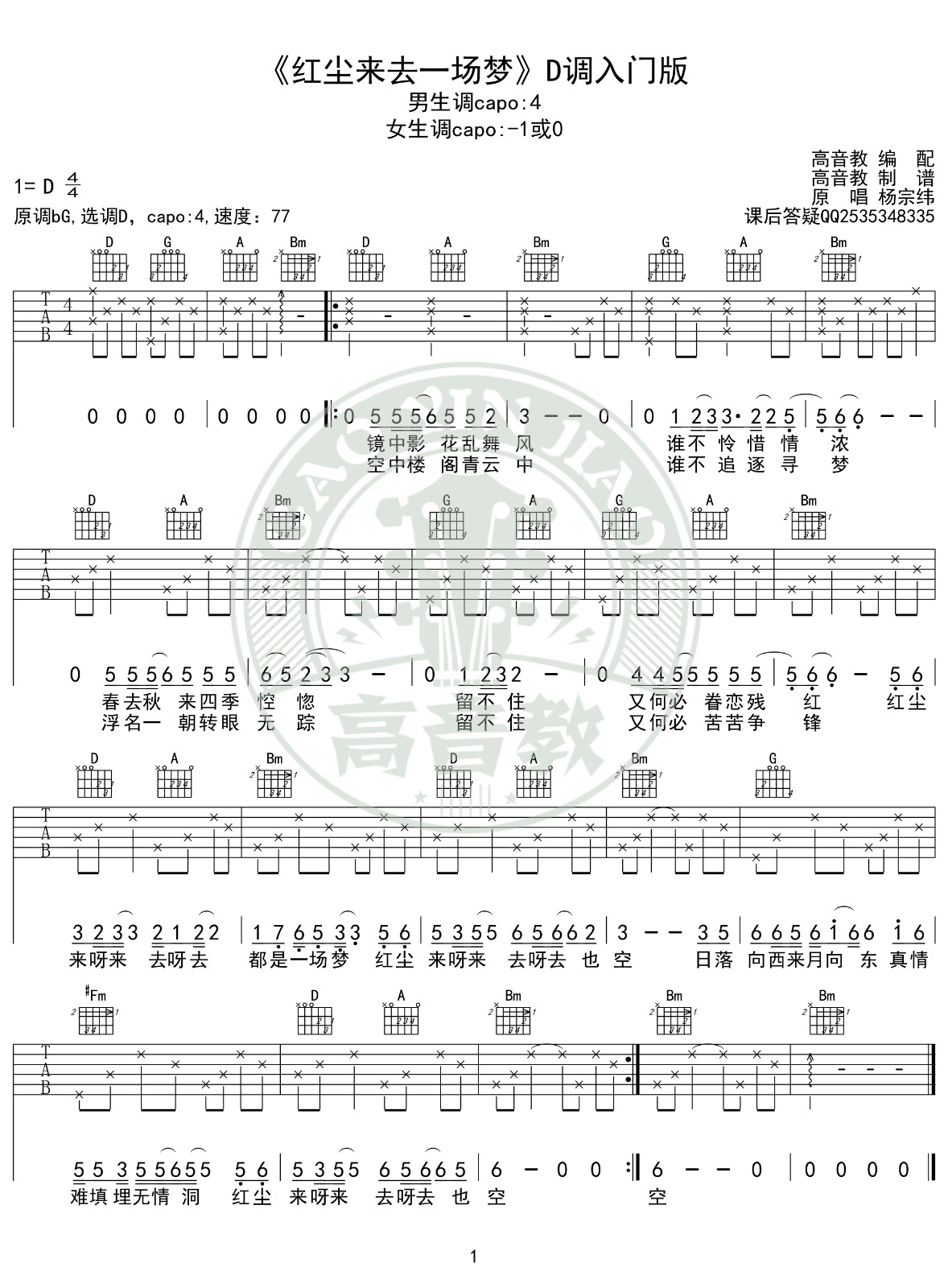 曲谱介绍: 红尘来去一场梦吉他谱,杨宗纬演唱,D调入门版,变调夹推荐,男生调夹四品。红尘来去一场梦六线谱,高清图片谱由高音教编配出品,整理上传。
