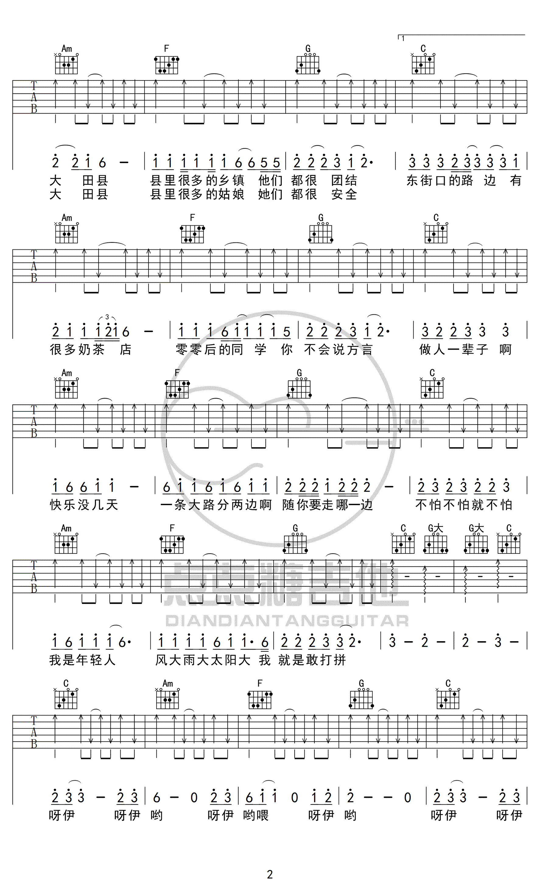 曲谱介绍: 大田后生仔吉他谱,丫蛋蛋演唱版本, 一首洗脑的闽南语歌曲爆火网络,原唱林启得,大田后生仔吉他六线谱,完整版共四张图片谱例。感谢点点糖吉他编配,整理分享。 编配提示:这首歌原调是D调,我选用的是C调指法编配,变调夹夹在吉他的2品位置,整首歌都是以扫弦为主。开头位置的闷音左手用手掌把弦护住,右手按照节奏型扫即可,模仿的是原版开头的架子鼓节奏。和声进行是最最经典的,我们所熟悉的1645(C Am F G),别看谱子有4页,大多都是反复段落,和弦也就这4个和弦。