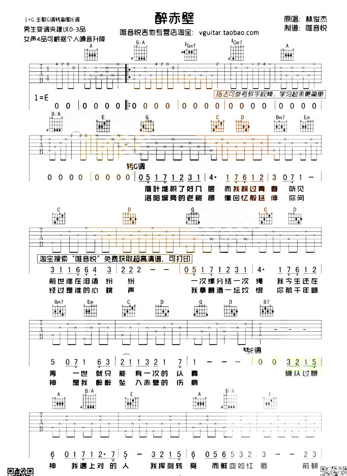 曲谱介绍:   《醉赤壁》是林俊杰演唱的歌曲,由方文山作词,林俊杰作曲,收录在林俊杰2008年10月18日发行的专辑《JJ陆》中。   这首歌曲是网络游戏《赤壁onlinegame》的主题曲。   《醉赤壁》由方文山作词,林俊杰作曲。林俊杰小就爱看三国的漫画,很喜欢赤壁的历史故事,尤其喜欢赵子龙和周瑜这两个角色,觉得他们很有气质,当林俊杰看了自己最喜欢的导演吴宇森拍的电影《赤壁》之后,更加希望以三国时代赤壁之战的故事作为题材写一首歌,于是林俊杰和方文山一起创作了《醉赤壁》这首歌曲。