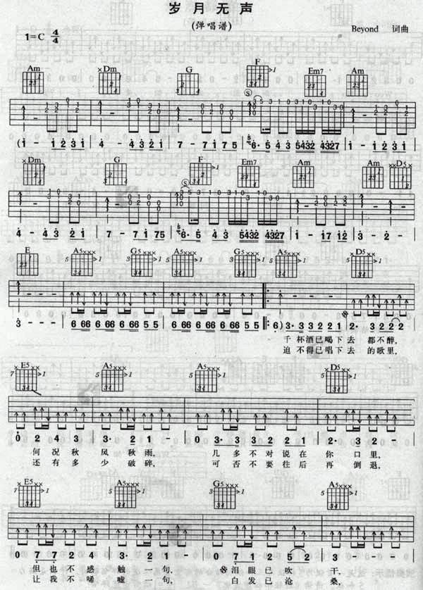 曲谱介绍:   《岁月无声》是中国香港殿堂级摇滚乐队Beyond的一首音乐作品,黄家驹作曲,刘卓辉作词。   《岁月无声》是中国香港殿堂级摇滚乐队Beyond的一首音乐作品,后来郑伊健翻唱的《刀光剑影》的曲取自《岁月无声》。   但是,这首歌曲尽管是由黄家驹作曲、刘卓辉作词,但原本的主唱者是麦洁文。最初这首歌是以情歌风格编曲的,不过之后由Beyond重新以摇滚风格演译,知名度比麦之版本更高。
