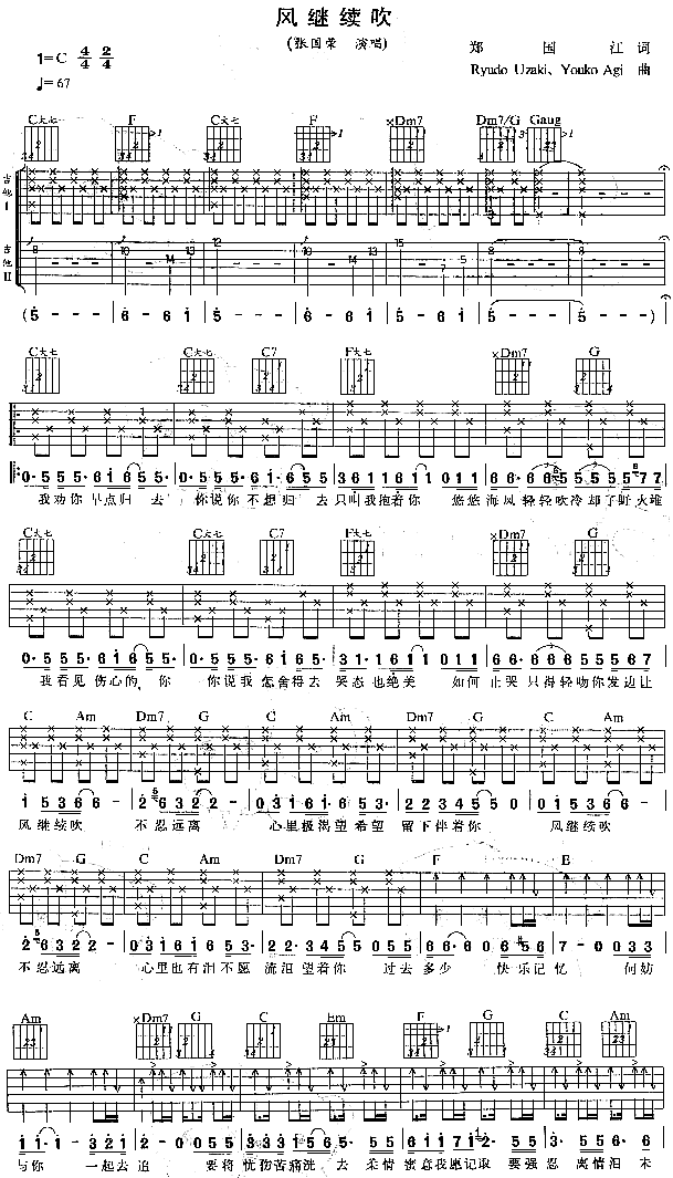 曲谱介绍:   《风继续吹》是张国荣演唱的歌曲,由郑国江填词,宇崎龙童作曲,收录在张国荣1983年发行的同名专辑《风继续吹》中。这首歌是张国荣的成名曲,同时也是他主演电影《纵横四海》的主题曲。   2010年,该曲荣获华语金曲奖30年经典评选“我最喜爱的歌曲”。   《风继续吹》是郑国江由情入景而创作的一首歌,歌词“我劝你早点归去,你说你不想归去,只叫我抱着你”,写的是小儿女的情;接着“悠悠的海风,冷却了野火堆,风继续吹”,写的是海边烧烤场的景致。