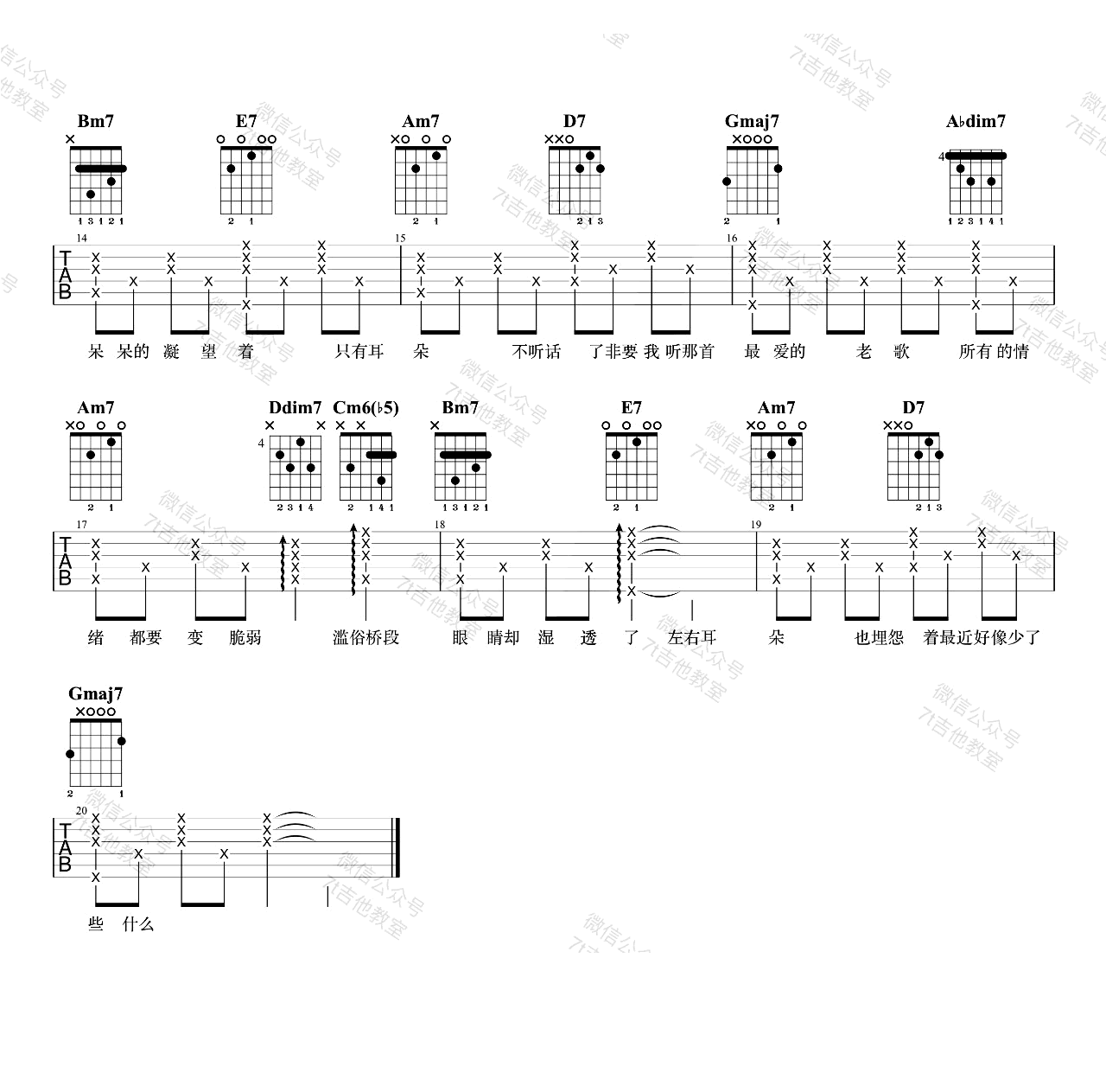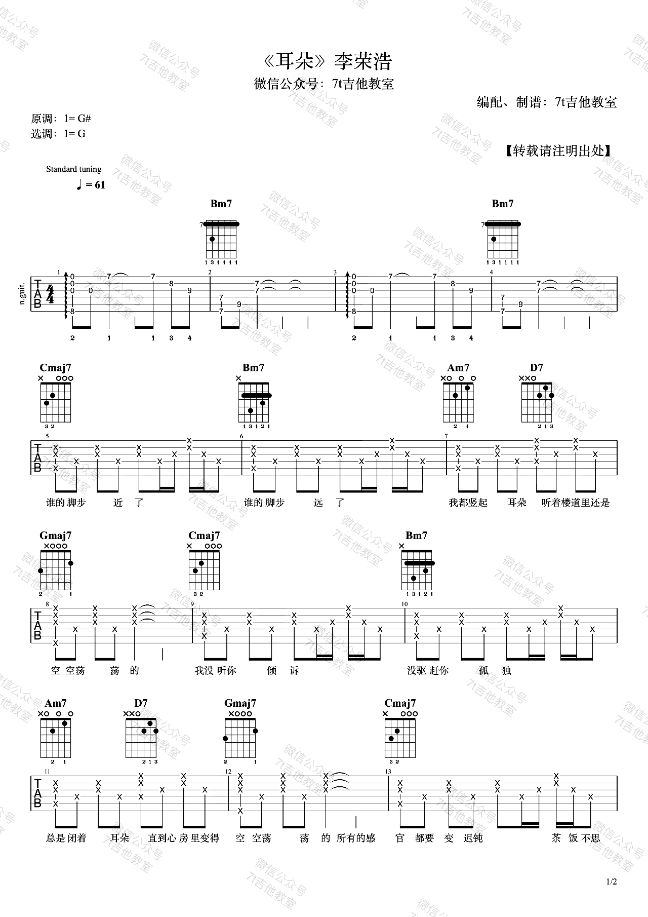曲谱介绍: 《耳朵》吉他谱,李荣浩在我们耳边轻轻唱出的一首寂寞之歌,耳朵六线谱,G调指法,变调夹夹一品。两张图片谱,7T吉他教室编配出品,吉他谱上传分享。 老师编配演奏说明:这首歌的原调是G#大调,我用的是G大调的指法来编配,视频里是降半音调弦,没有使用变调夹,适合音域较低的男生~想唱原调的童鞋可以标准音调弦,使用变调夹,夹在第1品就可以了哦!