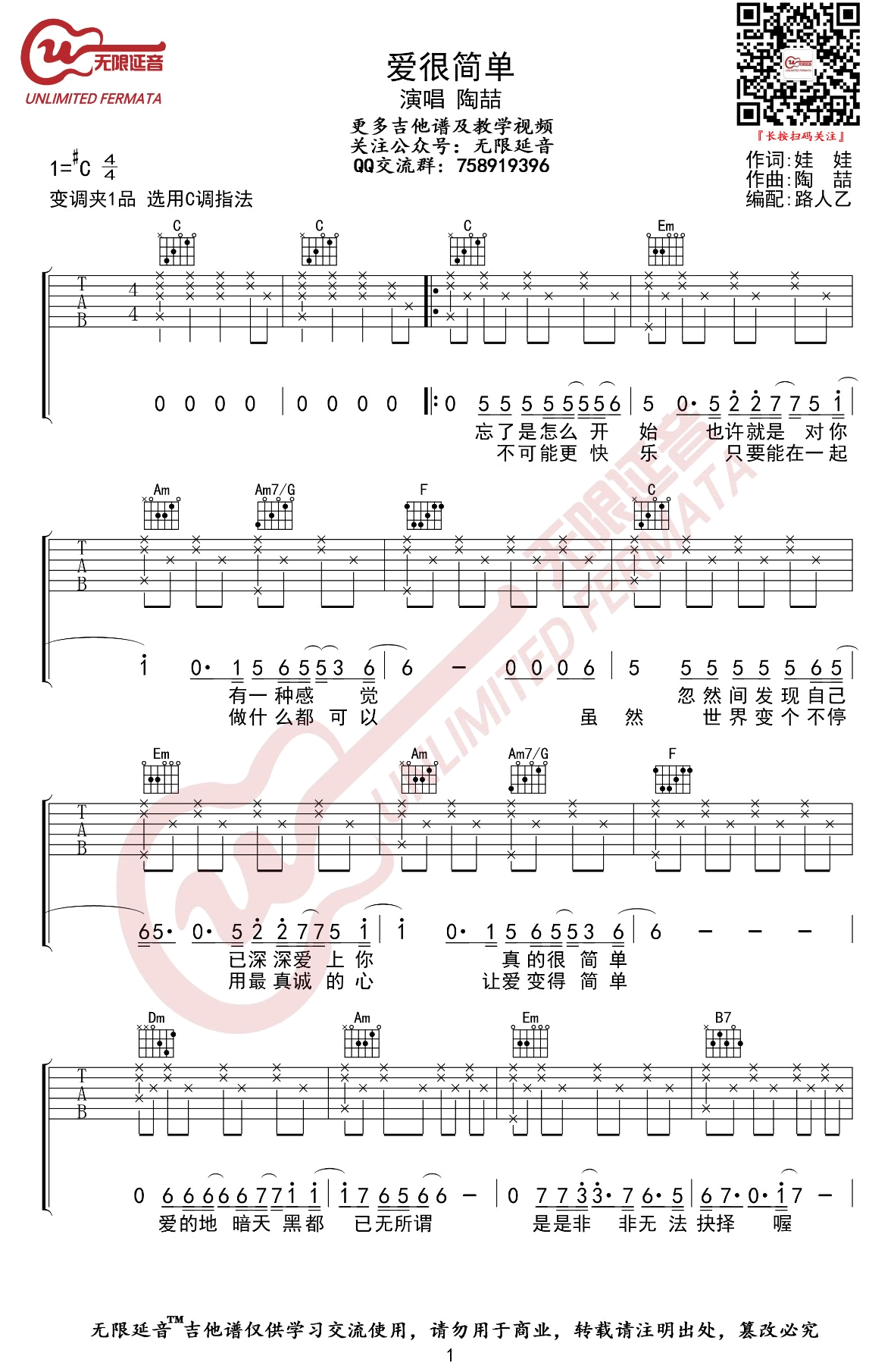曲谱介绍: 《爱很简单》吉他谱,陶喆演唱的一首经典老歌,C调指法,采用变调夹夹一品。爱很简单六线谱,三张弹唱图片谱。无限延音编配出品,整理分享。 一开篇便以轻快明丽的曲调、律动飘忽的音符渲染青少年初尝爱情的甜头,那就是简单的爱!不是坎坎坷坷、曲曲折折,而是忽然间的情绪、就这样萌发的爱意冲动。谁都曾疯狂纯粹得爱过,因此很容易引起观众的共鸣。