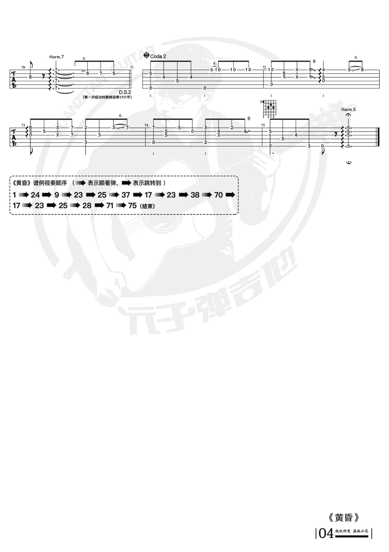曲谱介绍: 《黄昏》指弹谱,押尾桑的经典代表作品,Twilight十周年版吉他独奏谱,完整版共四张图片谱,感谢元子编配制谱,并为琴友们带来最完美最完整的翻弹视频谱例同步吉他指弹教学,指弹吉他教程。吉他谱分享上传。 元子老师编配说明:这首曲子尤其在左手上需要注意的细节还是比较多的,难度上就有点往爵士的感觉靠,有些指法的选择和安排还是比较讲究的。考虑到五线谱更多的是反映出乐理相关知识,不能直接反映指法,单纯对于弹奏而言可能必要性不是特别大,所以最后决定只保留六弦谱了。