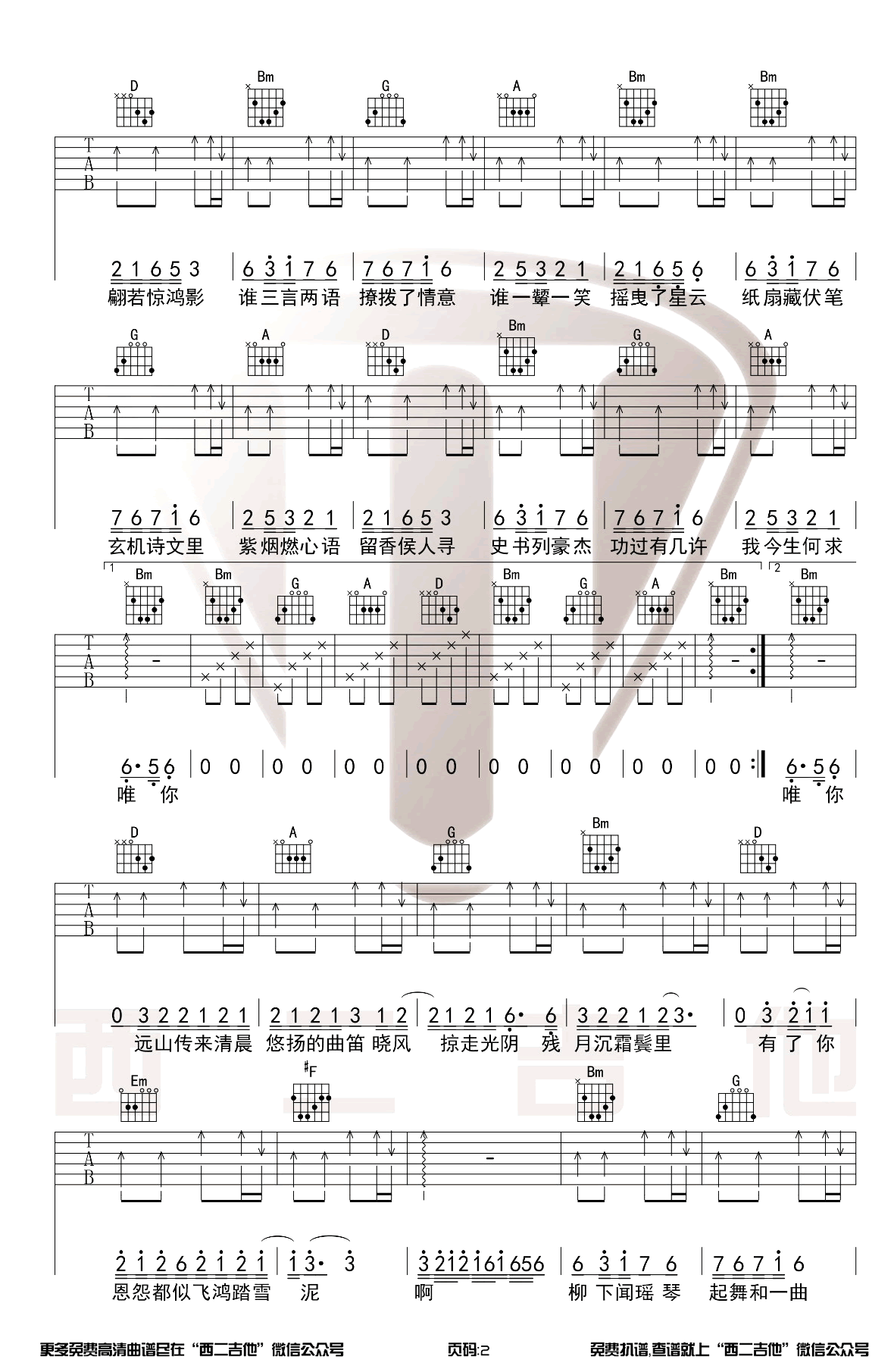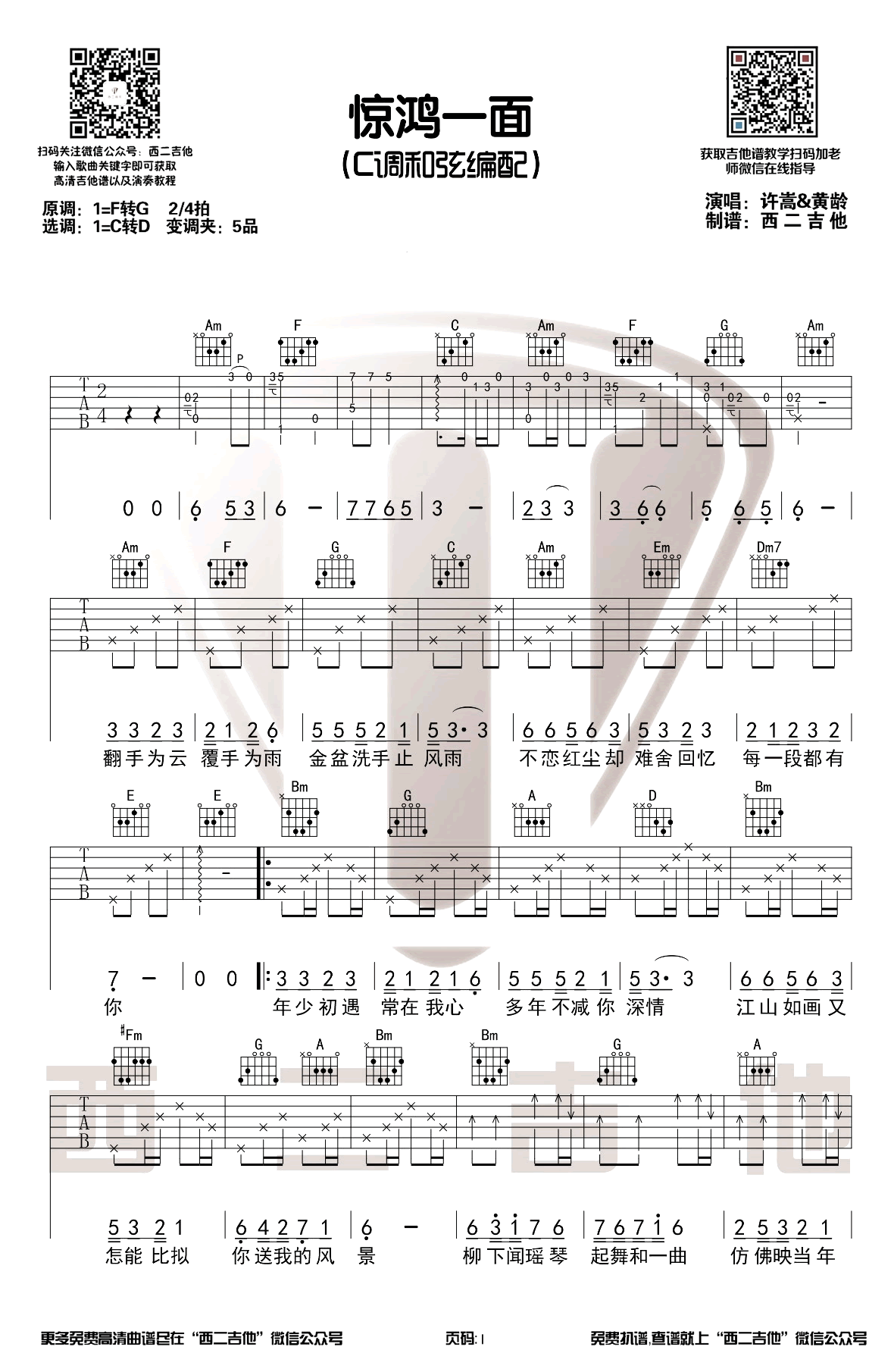 曲谱介绍: 惊鸿一面吉他谱,许嵩和黄龄合作演唱的一首古风歌曲,惊鸿一面六线谱,原调F转G,选调C转D,变调夹夹五品。西二吉他编配出品,更新分享。 一首许嵩的经典歌曲,词曲编配的非常好,不过由于是男女合唱,而且在调式上是经过短暂的主歌之后就开始整体升调了,所以演唱起来还是有一点难度的,需要大家好好去把握。大家可以欣赏一下火山老师的演奏视频。