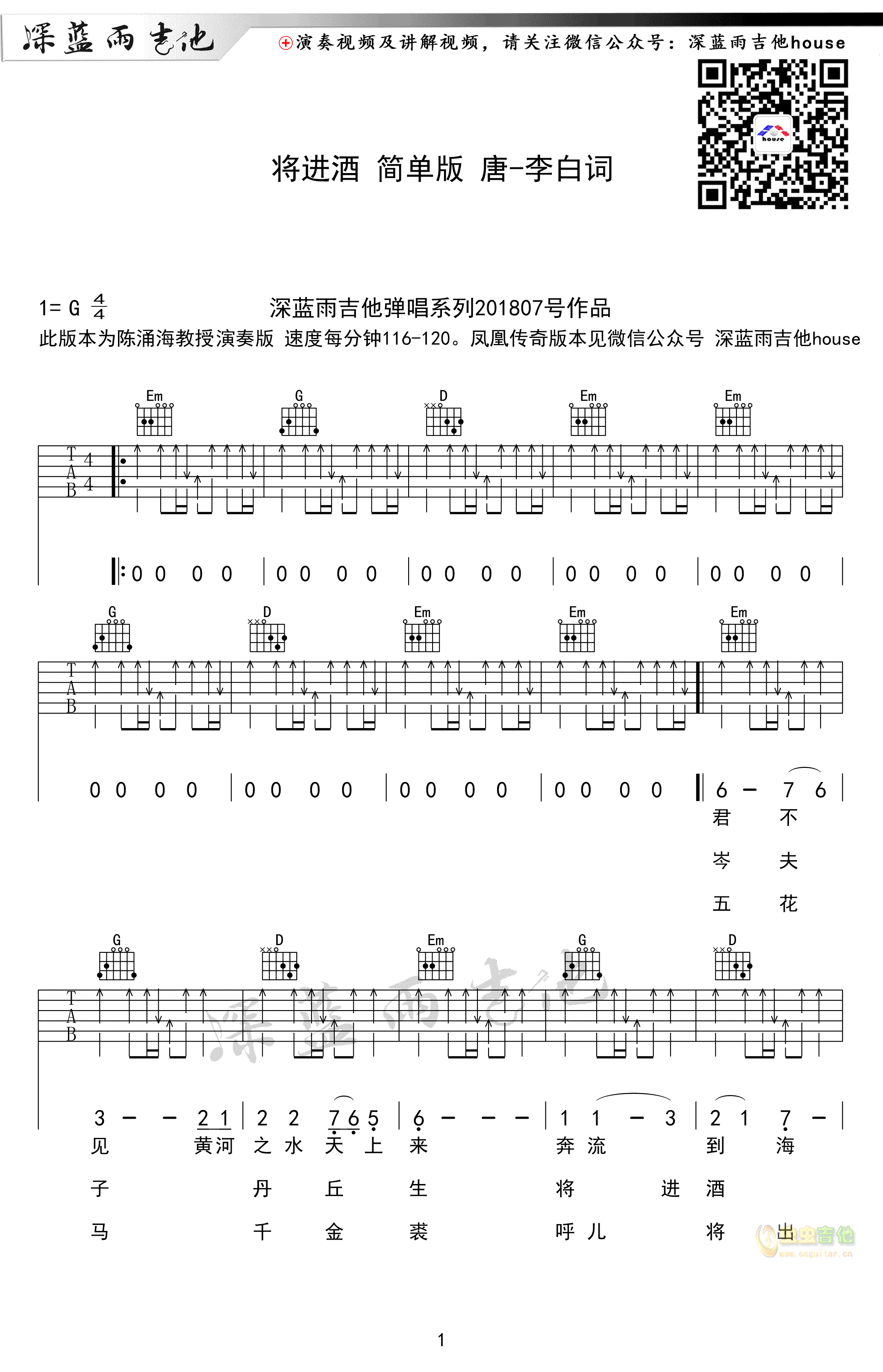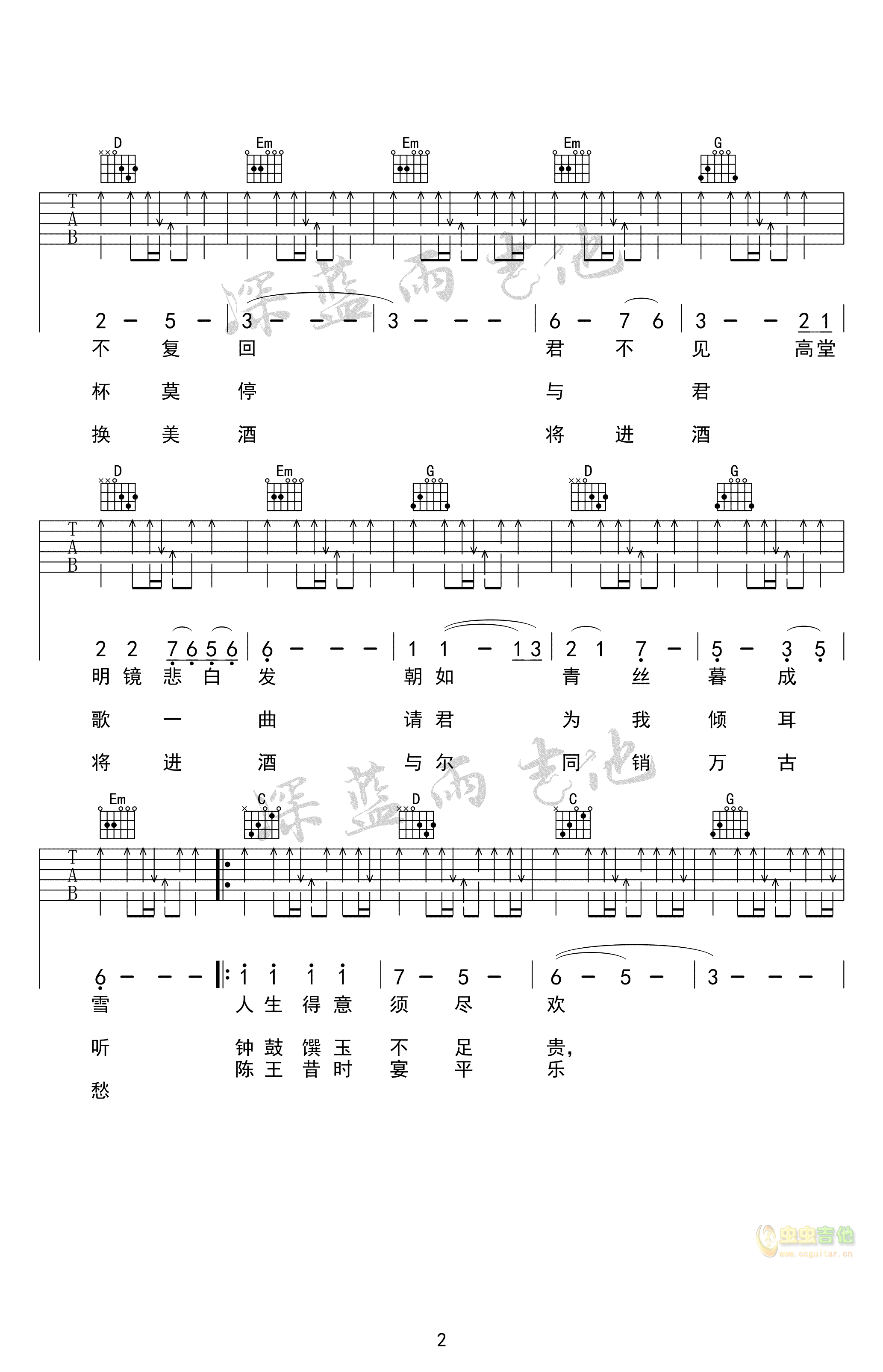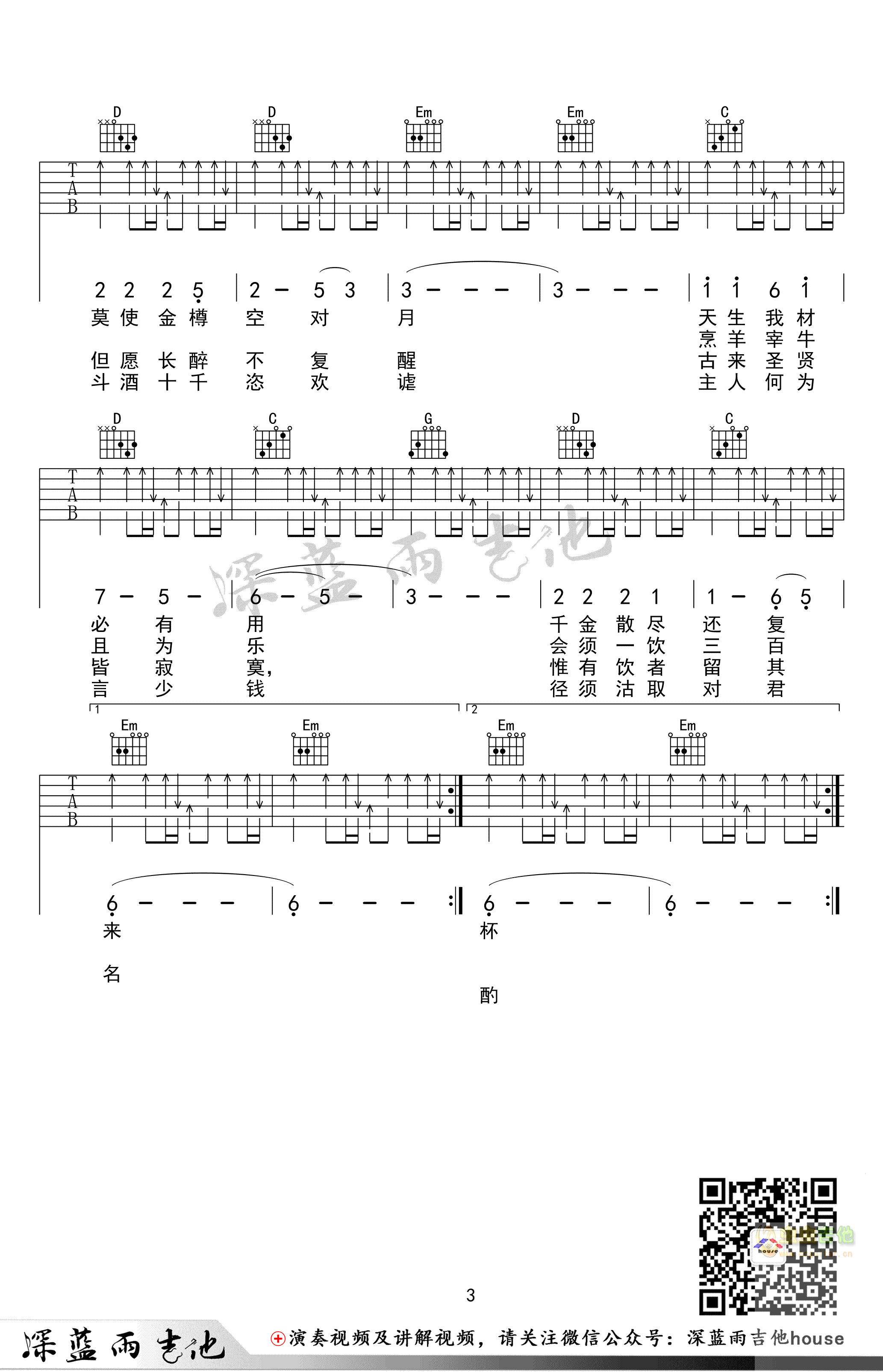 曲谱介绍: 厨子和戏子《将进酒》吉他弹唱谱,共有3张高清图谱。