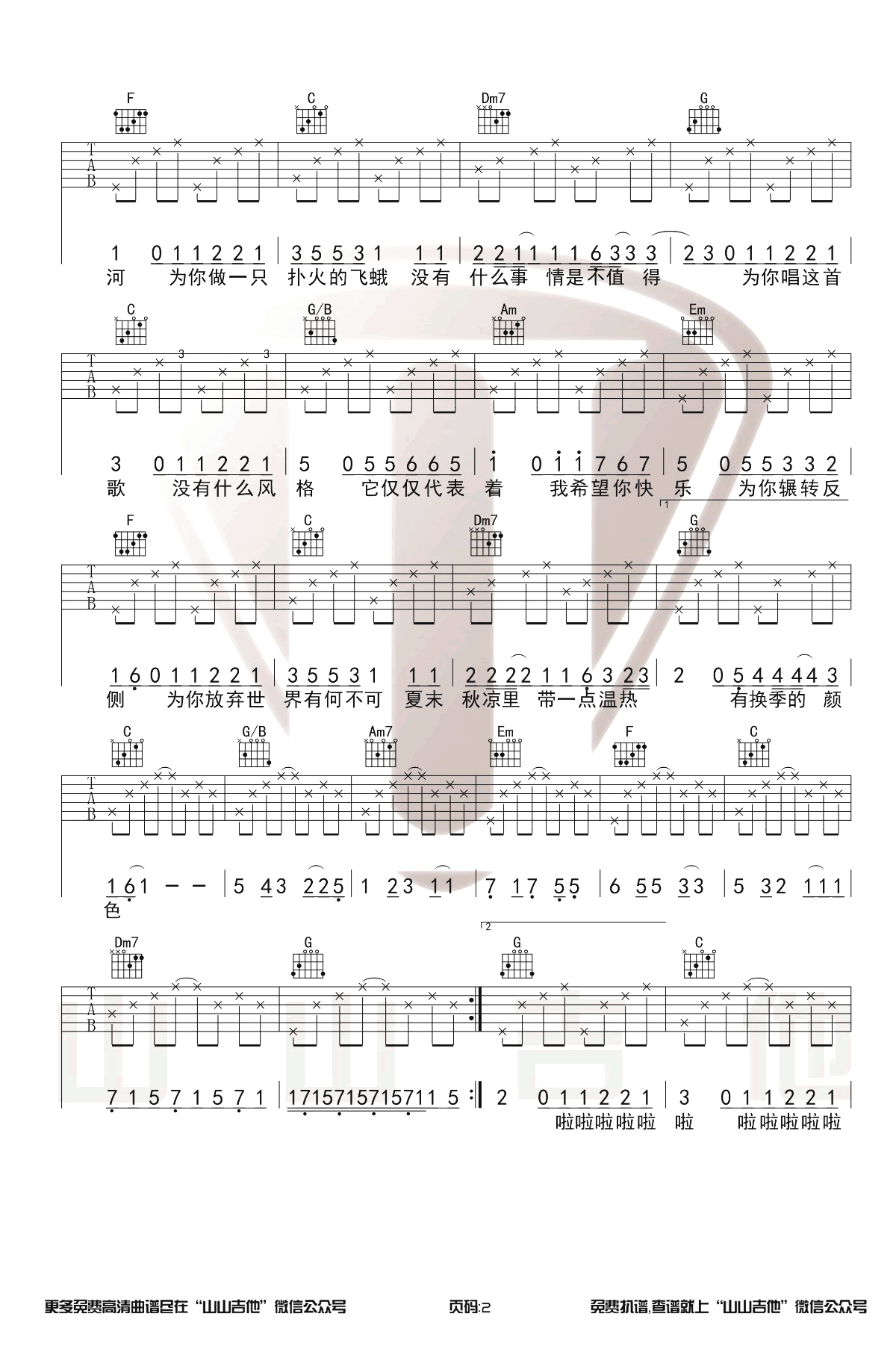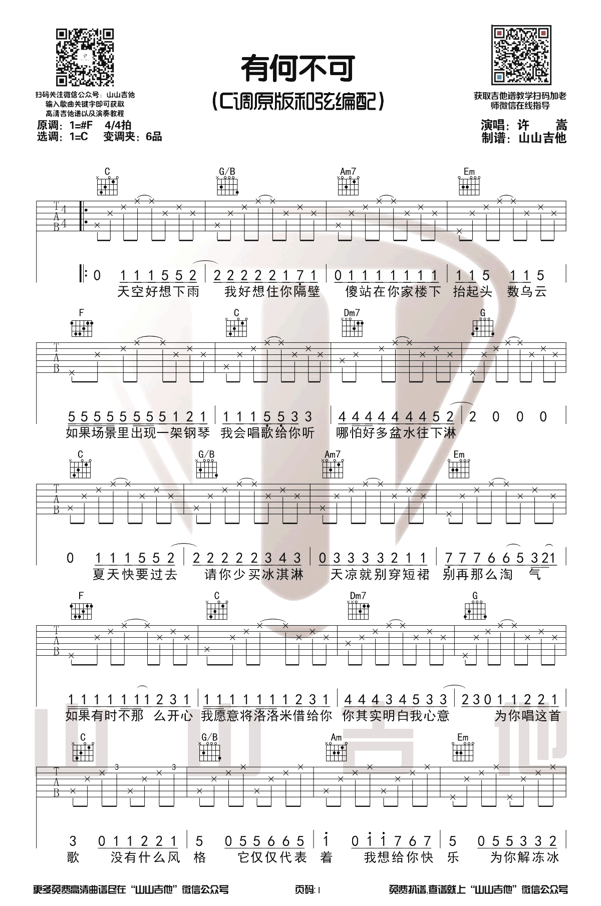 曲谱介绍: 《有何不可》吉他谱,许嵩出道第一张专辑的一首代表歌曲,原调升F,选用C调原版和弦编配,变调夹夹六品。有何不可六线谱,完整版共三张图片谱。西二吉他编配出品,整理上传。 一首老歌带我们回到美好清新的青春时光,只想为你唱首歌,没有什么风格,为你放弃世界又有何不可。温暖俏皮的歌词,明快跳跃旋律,融合Rap自由的节奏,给人耳目一新的感受。