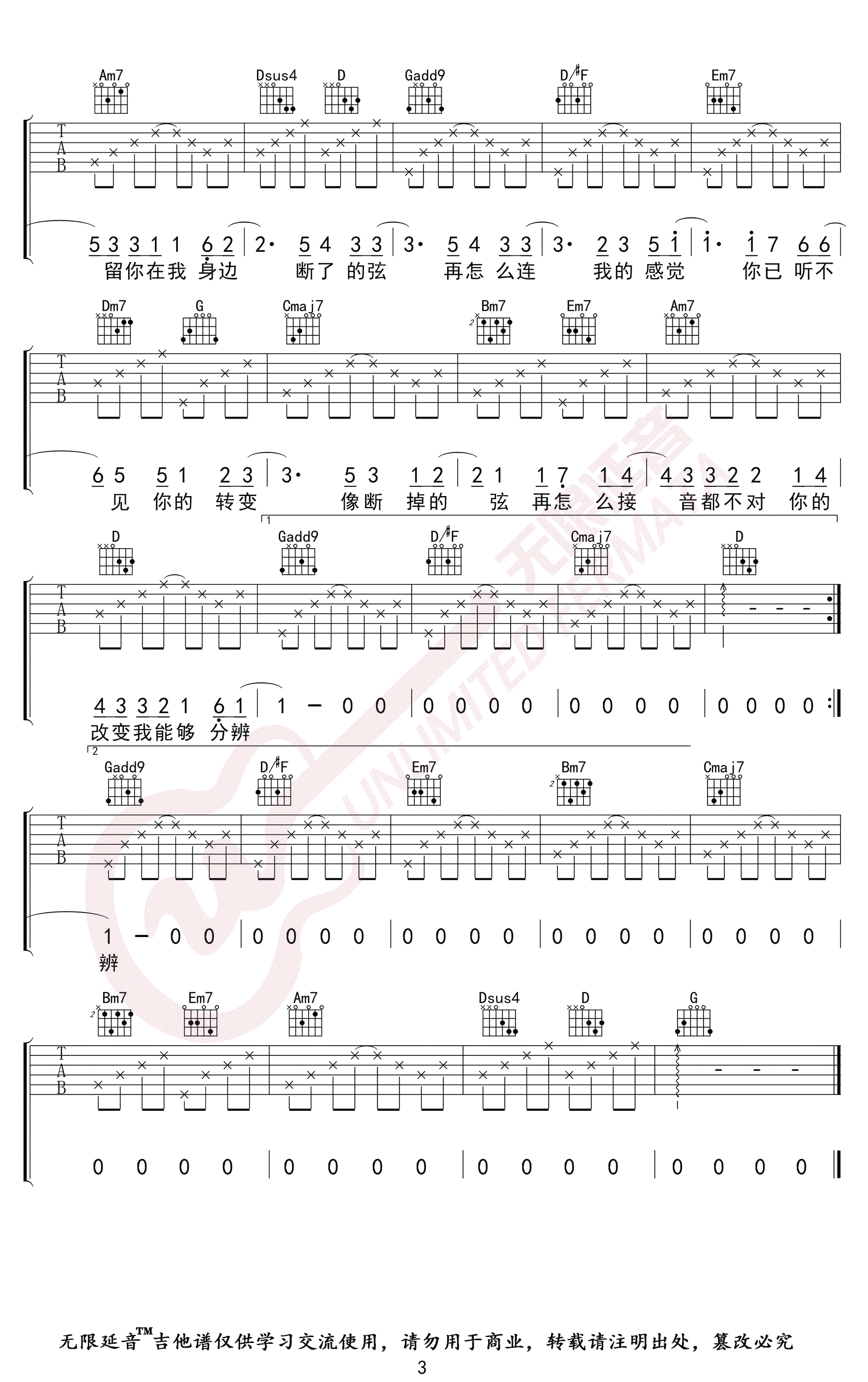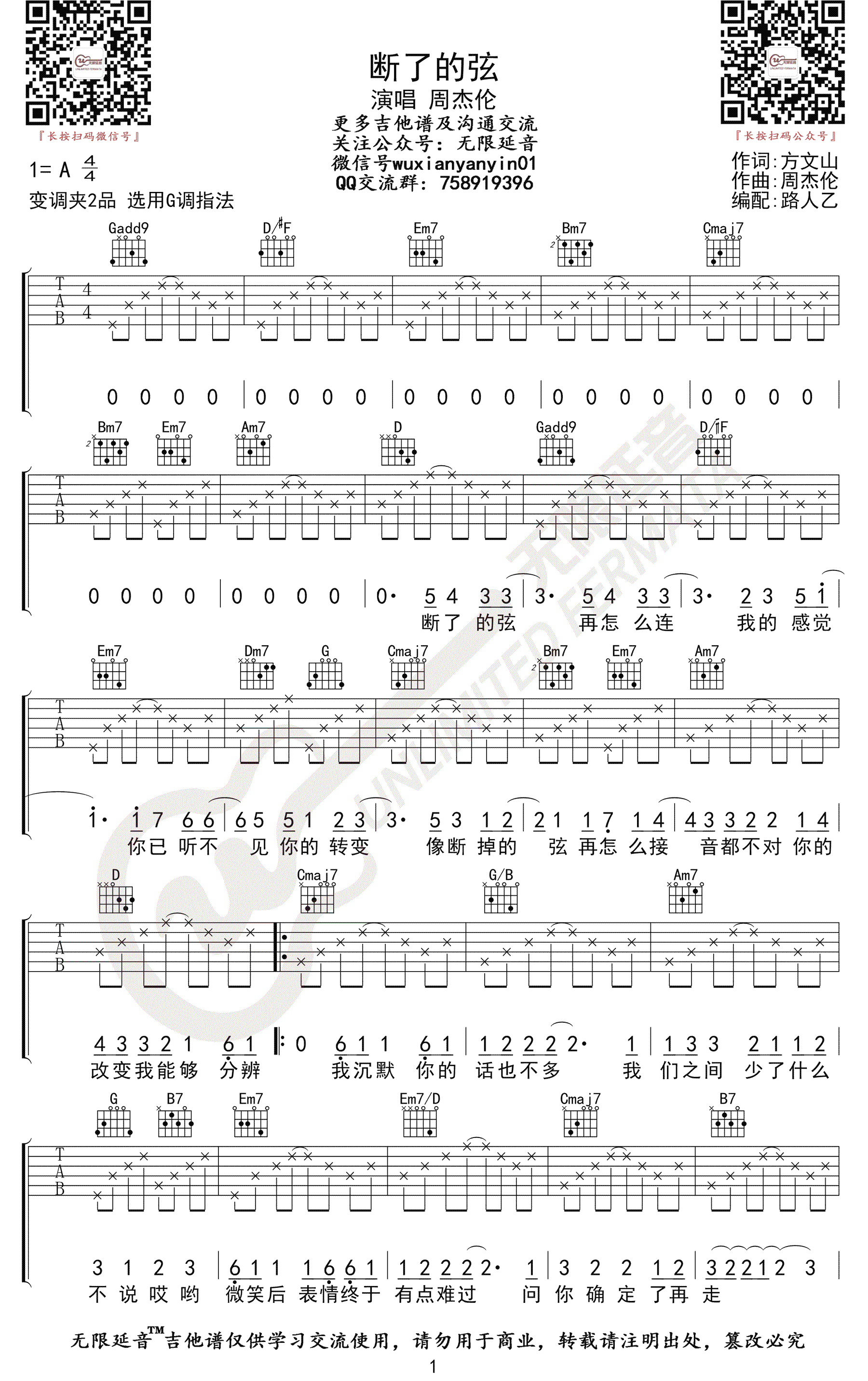曲谱介绍: 《断了的弦》吉他谱,周杰伦演唱的一首老歌,断了的弦六线谱,原调A,变调夹夹第二品,选用G调指法,无限延音编配出品,为琴友们更新上传。 这首典型的周氏R&B情歌,十多年后的今天又火了!曲子很温柔,歌词也让人心碎,随风在飘摇啊摇这段,真的非常抓耳洗脑。我们的感情就像断了的琴弦一样,声音再也不会回到从前,伤感唯美的歌声给人无尽的回忆。