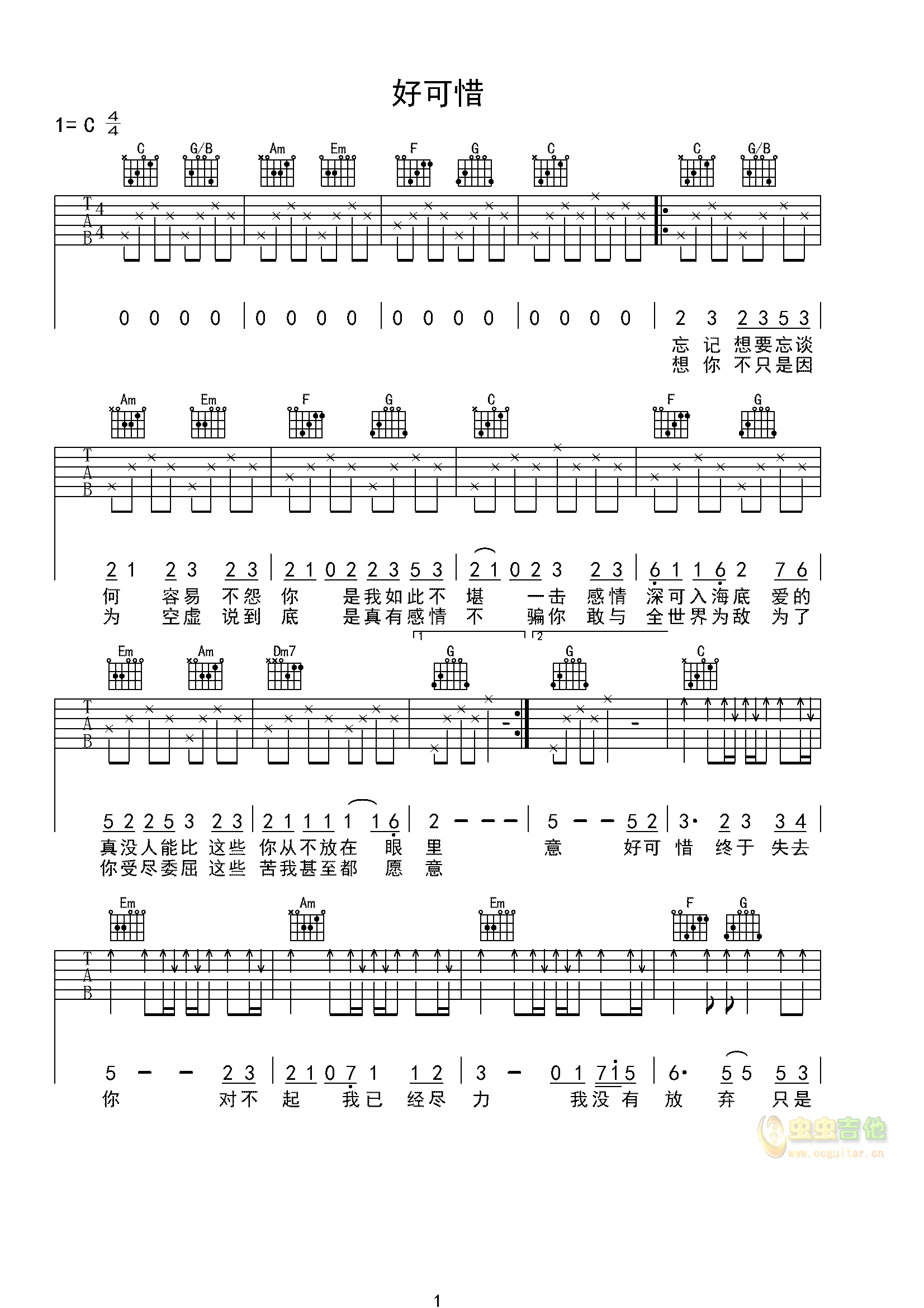 曲谱介绍: 《好可惜》吉他弹唱谱,共有2张高清图谱,免翻页排版设计。