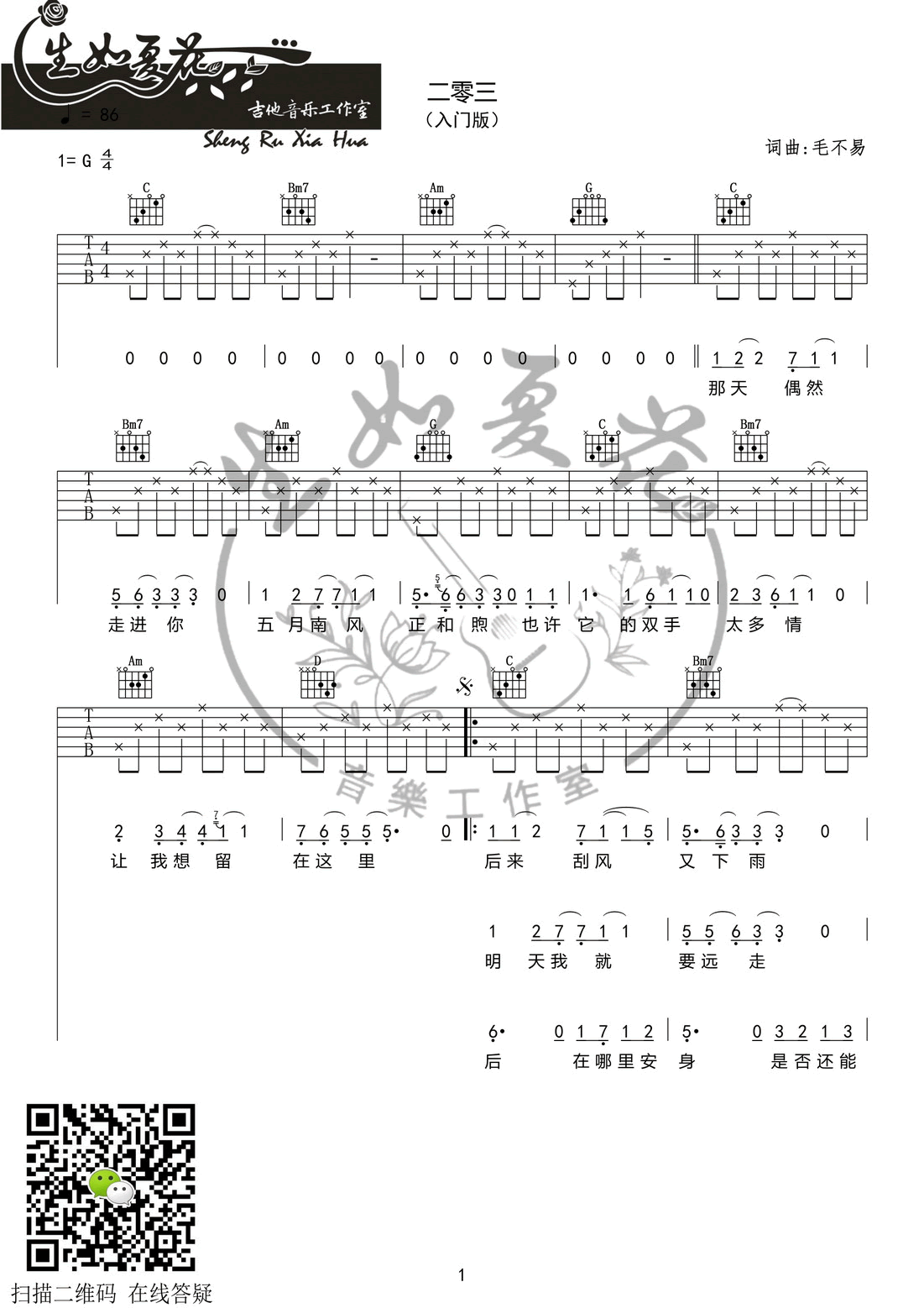 二零三吉他谱 - 毛不易 - 吉他弹唱谱