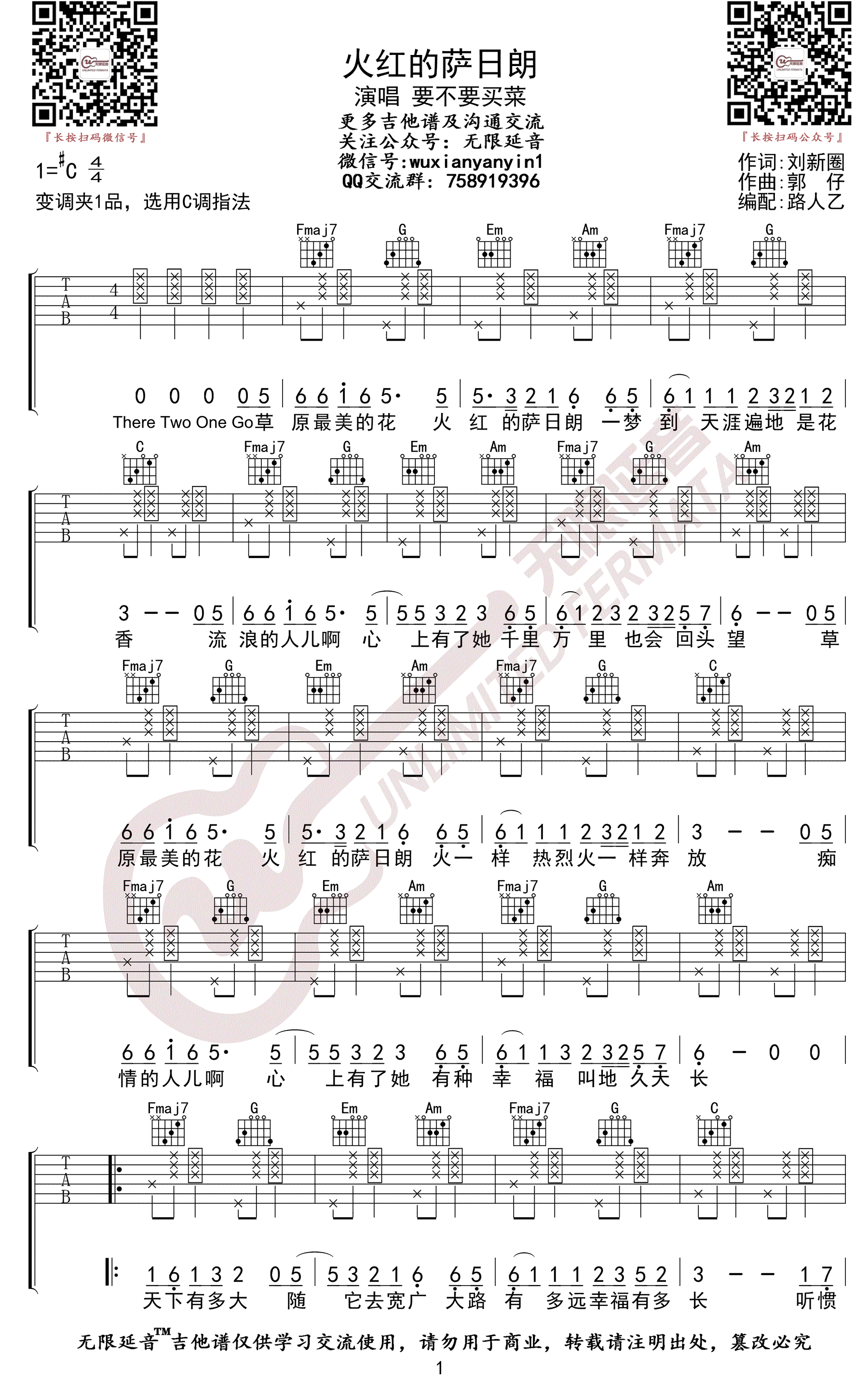 曲谱介绍: 《火红的萨日朗》吉他谱,要不要买菜翻唱,乌兰托娅的的一首广场舞神曲,火红的萨日朗六线谱,原调升C,变调夹夹一品,选用C调指法,共三张高清图片谱。无限延音编配分享,吉他谱上传更新。 “萨日朗”在蒙语里是草原上的山丹花的意思,代表着团结热情奔放,就像是草原上女神,张扬着婀娜多姿的身段,以及奔放的个性,让人激情澎湃的动听歌声里,抒发着对草原深沉的爱恋和向往。