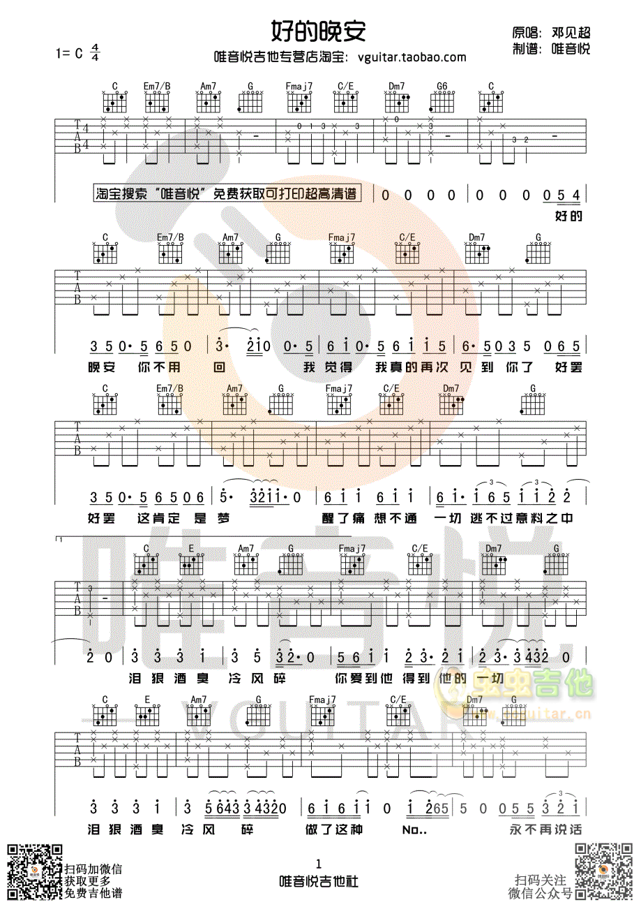 好的晚安吉他谱 - 吉他弹唱谱