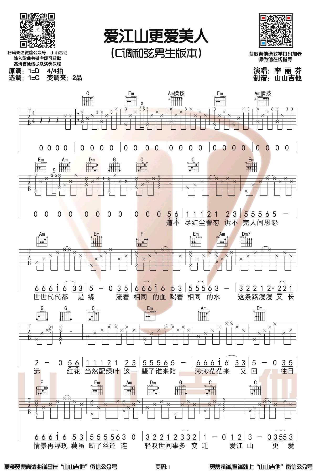 曲谱介绍: 《爱江山更爱美人》吉他谱,李丽芬一首中国古典风格的经典歌曲,也因《倚天屠龙记》片尾曲而广受欢迎。爱江山更爱美人六线谱,原调D,选C调和弦男声版本编配,两张图片谱由山山吉他制谱分享,整理上传。 江山美人是所有中国顶级故事情境的本质,歌曲词意练达,旋律通俗上口,让人感受一份江湖豪情。随谱附上歌曲吉他弹唱视频,琴友们可以跟随老师的演示配合曲谱练习。