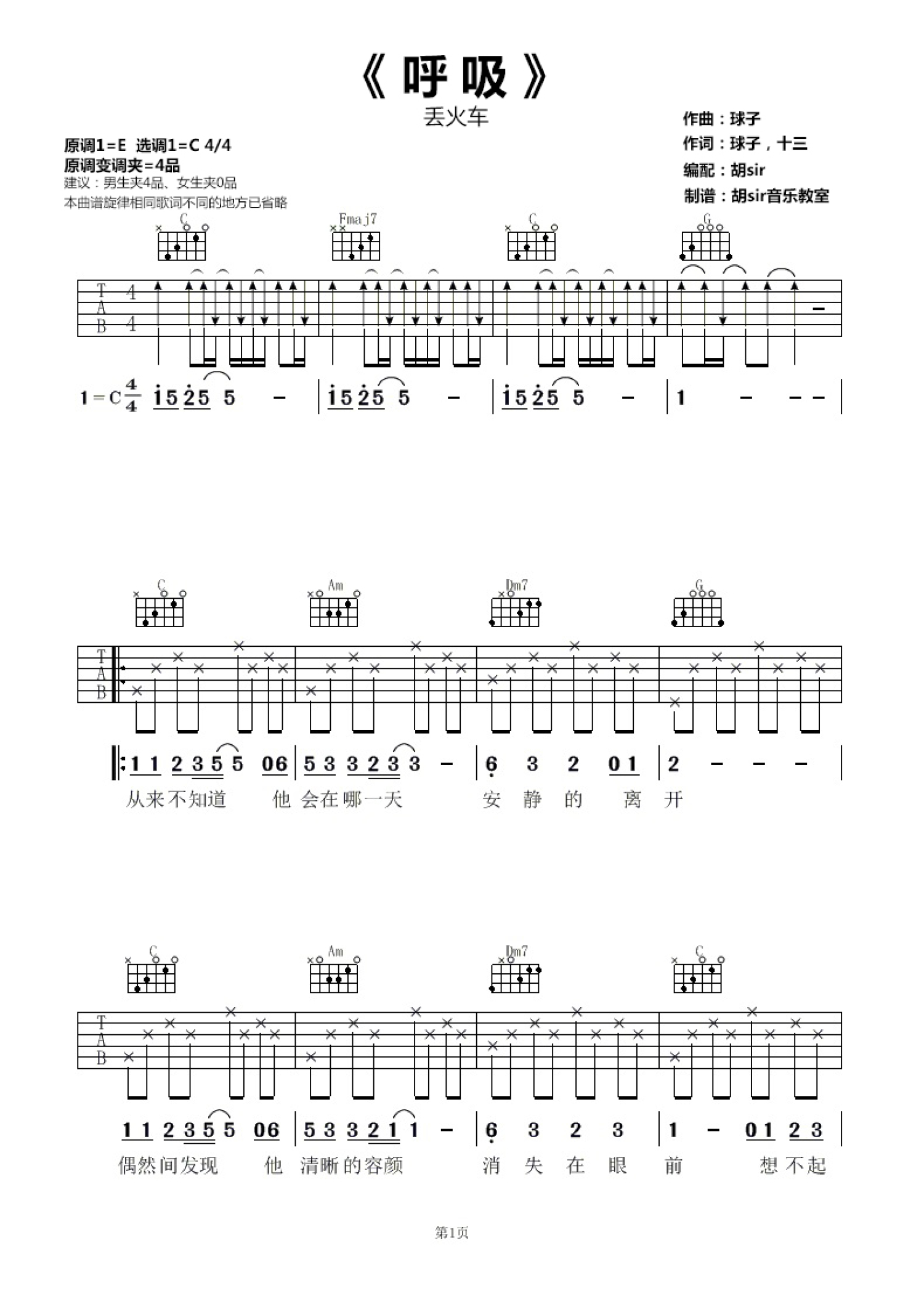 • 呼吸吉他谱 - 丢火车乐队 - C调吉他弹唱谱第1张