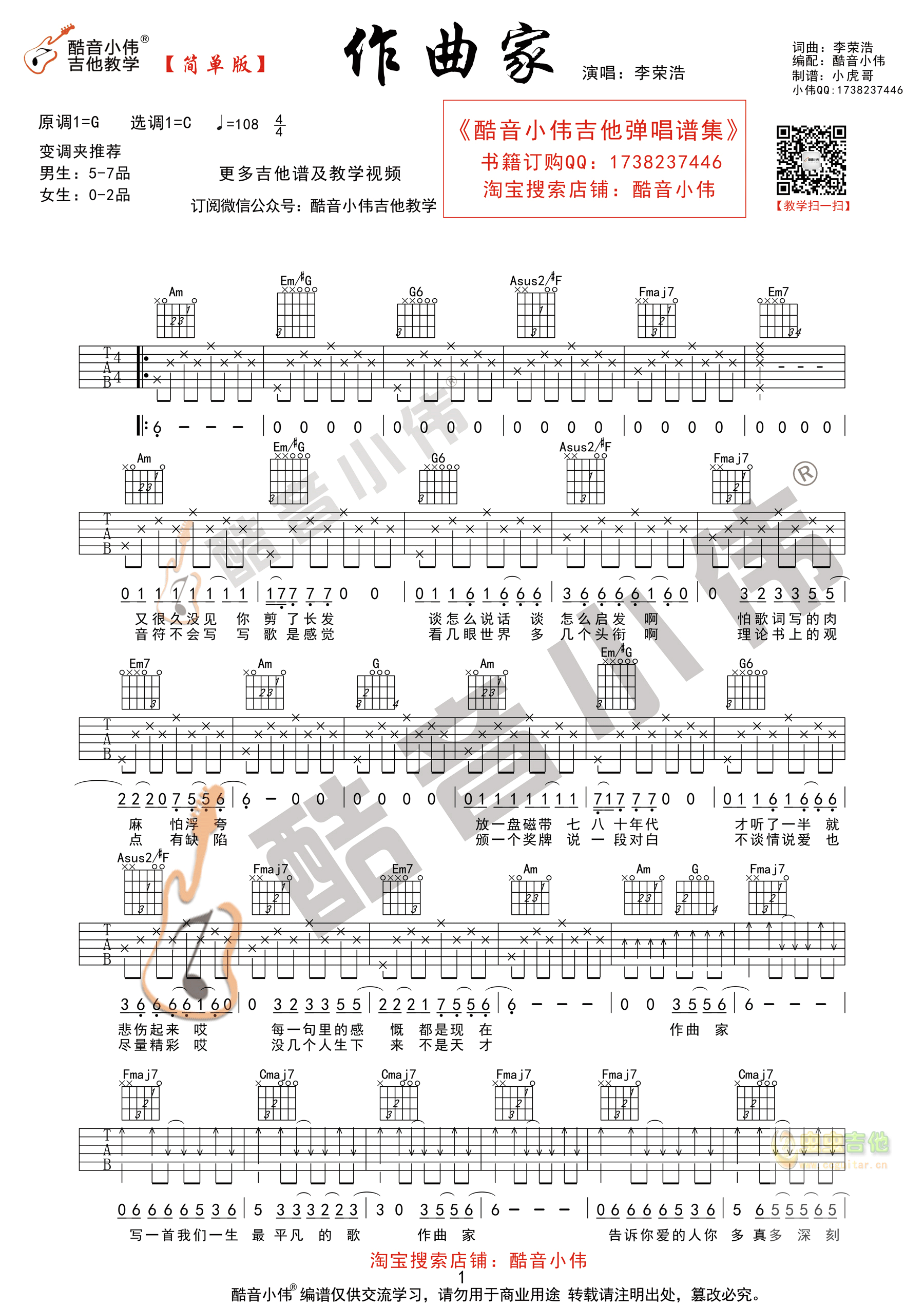 作曲家吉他谱 - 李荣浩 - 吉他弹唱谱