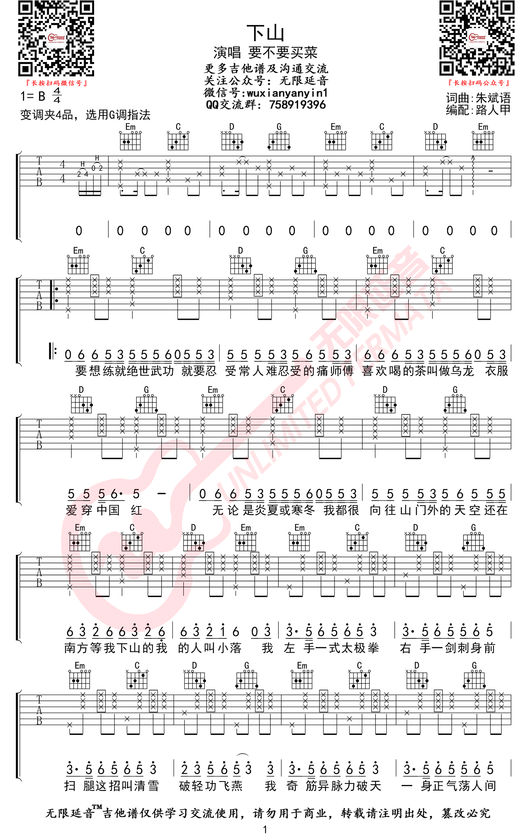 曲谱介绍: 《下山》吉他谱,要不要买菜演唱,一首网络热门古风民谣歌曲。下山六线谱,G调指法,变调夹夹四品,高清弹唱图片谱共两张谱例,无限延音编配分享,吉他谱更新上传。 歌曲讲述了一个离开师门、独自下山的道士的故事,简单的歌词和抓耳的古风旋律搭配,依旧可以营造出韵味十足的氛围。歌里的小道士把除暴安良当做自己的心愿,让整首歌充满着诙谐的侠气。