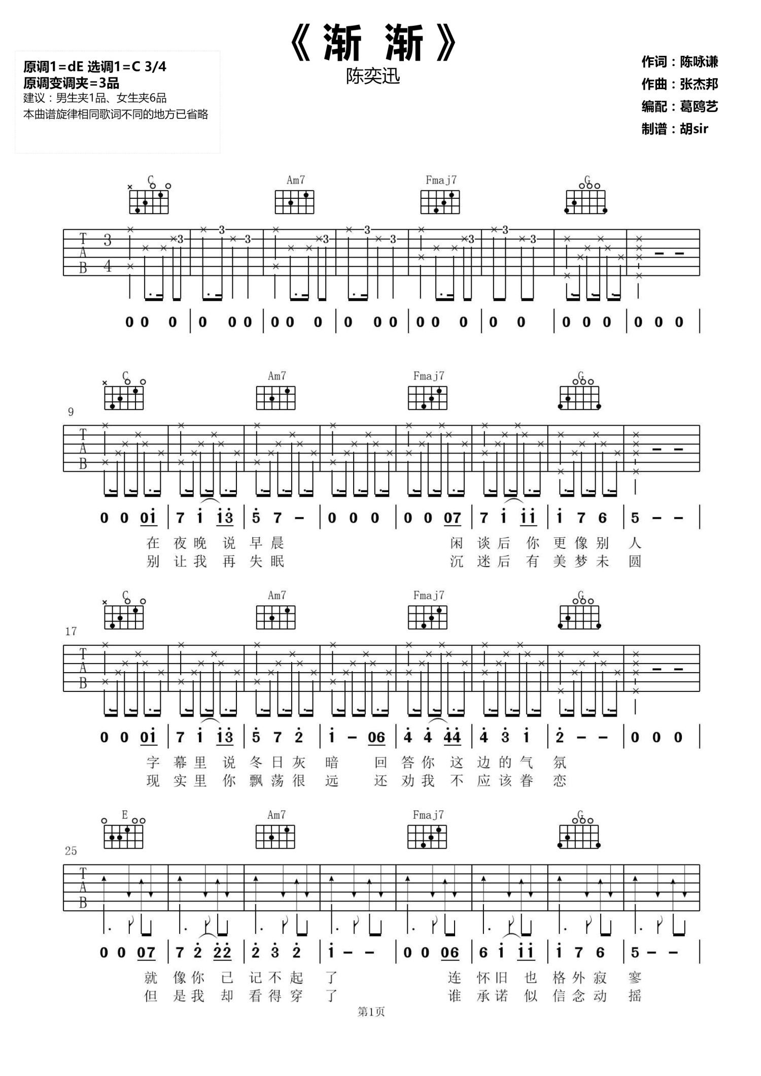 曲谱介绍: 陈奕迅《渐渐》吉他谱原调降B调,变调夹夹3品;选调C调指法编配,变调夹男生建议夹一品,女生建议夹六品。陈奕迅最新一首粤语歌曲,渐渐六线谱,高清图片谱三张谱例,感谢胡sir音乐教室出品从遗憾到忘记,我只能拜托时间,2018以爱为出发的专辑《L.O.V.E》中的一首慢板情歌,淡淡然的诉说分手后的孤寂,却充满伤感情绪。