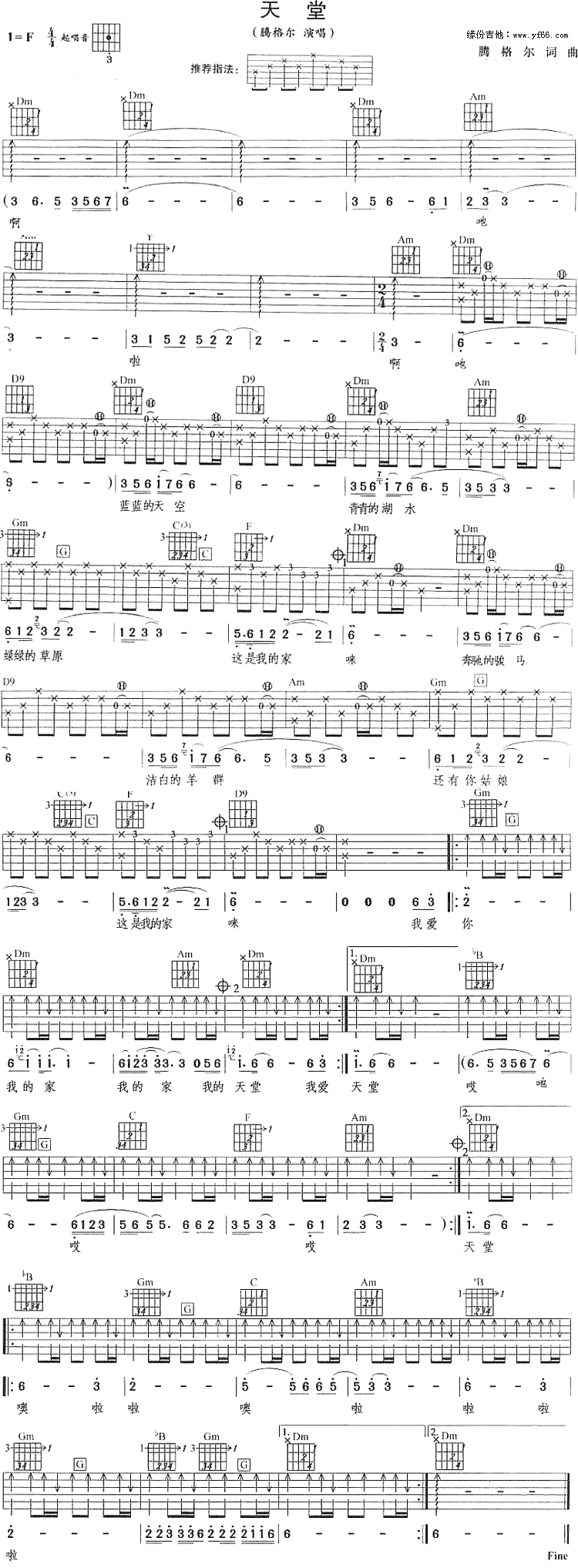 曲谱介绍:   《天堂》是腾格尔作词、作曲并演唱的歌曲,收录于腾格尔1997年发行的专辑《出走》中[1]。2001年6月,腾格尔推出了《天堂》的英文版。   2000年,该曲获第6届中国原创歌曲金奖。2001年1月,获第七届全球华语音乐榜中榜金曲;同年5月,获首届“金钟奖”声乐作品铜奖。
