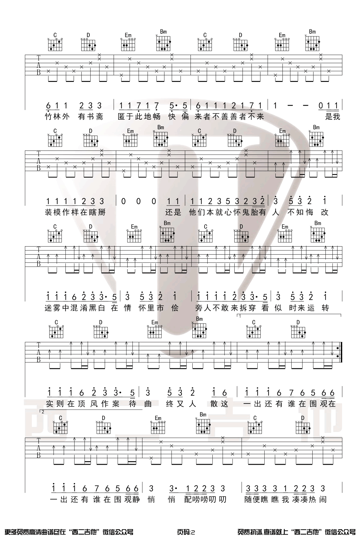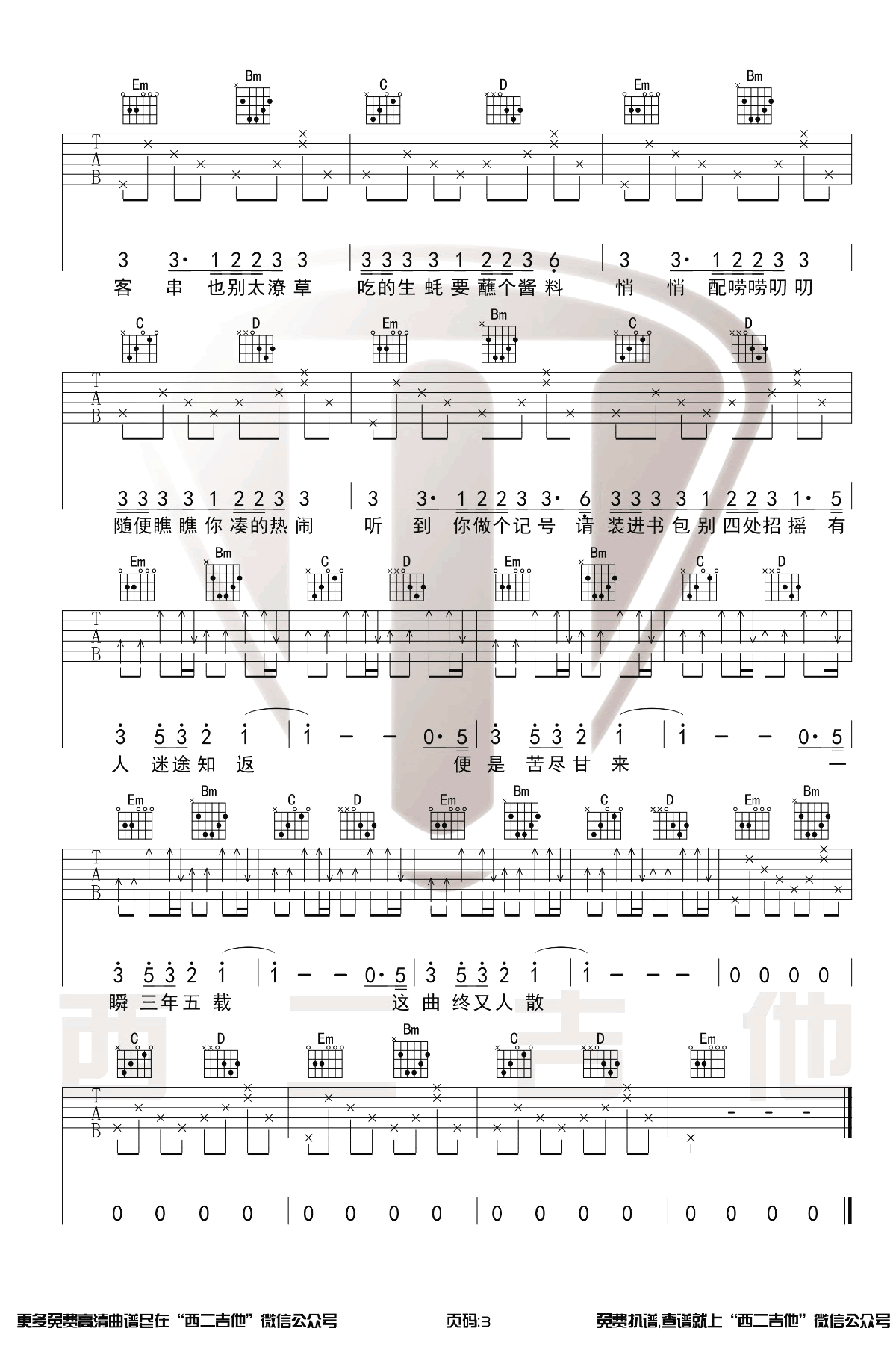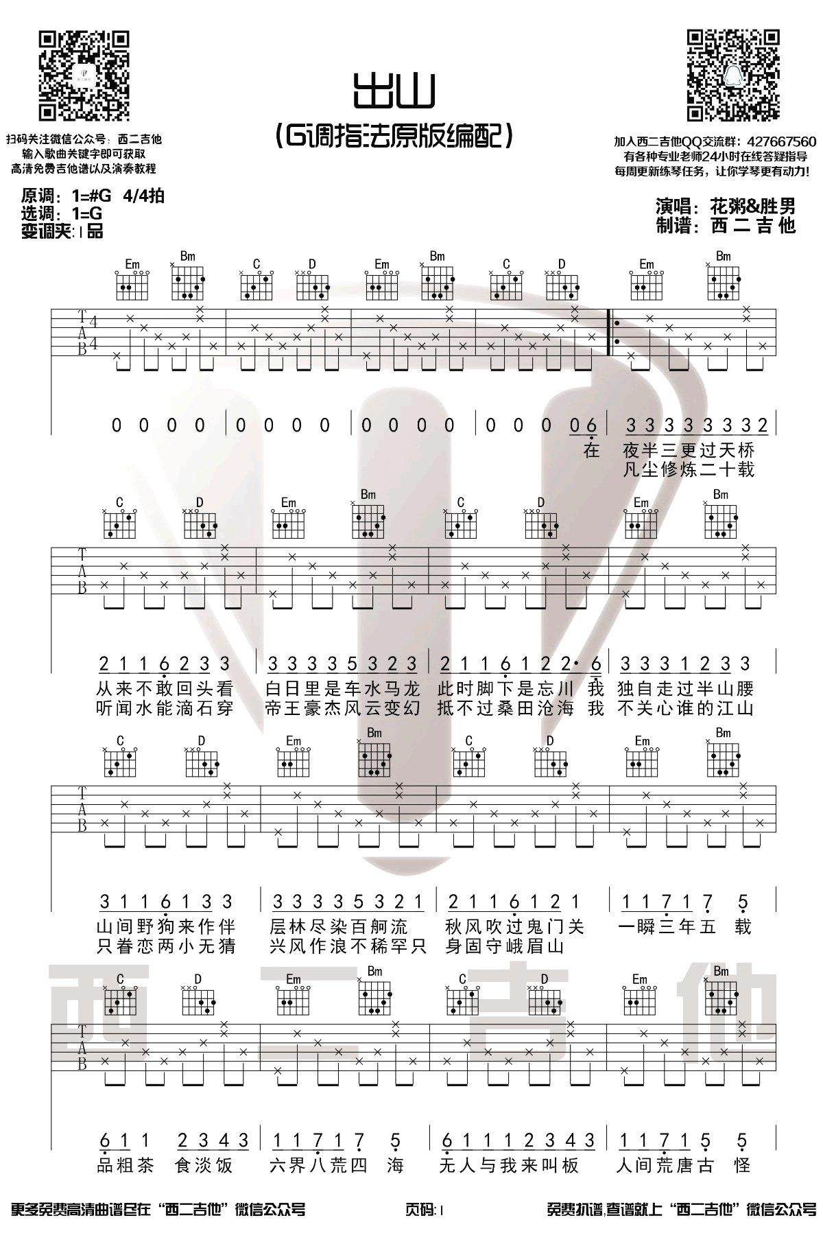 曲谱介绍: 《出山》吉他谱,花粥王胜男合作演唱的一首充满了节奏感的魔性歌曲,原调#G,选用G调指法原版编配,变调夹夹一品。出山六线谱,三张图片谱,西二吉他制谱分享,更新上传。 吉他谱说明:整首歌采用四个和弦循环的进行方式演奏,前面是分解部分,熟练后很有原版的感觉,技术好的琴友们可以在这里加入制音的技巧更有味道!后半部分采用扫弦的节奏型,注意强弱区分突出歌曲的节奏,这首歌弹起来容易,唱起来可就难了,副歌部分连续的八度音高转换可不是一般人能够驾驭的了的,喜欢这首歌的话快跟着火山老师一起学习吧!