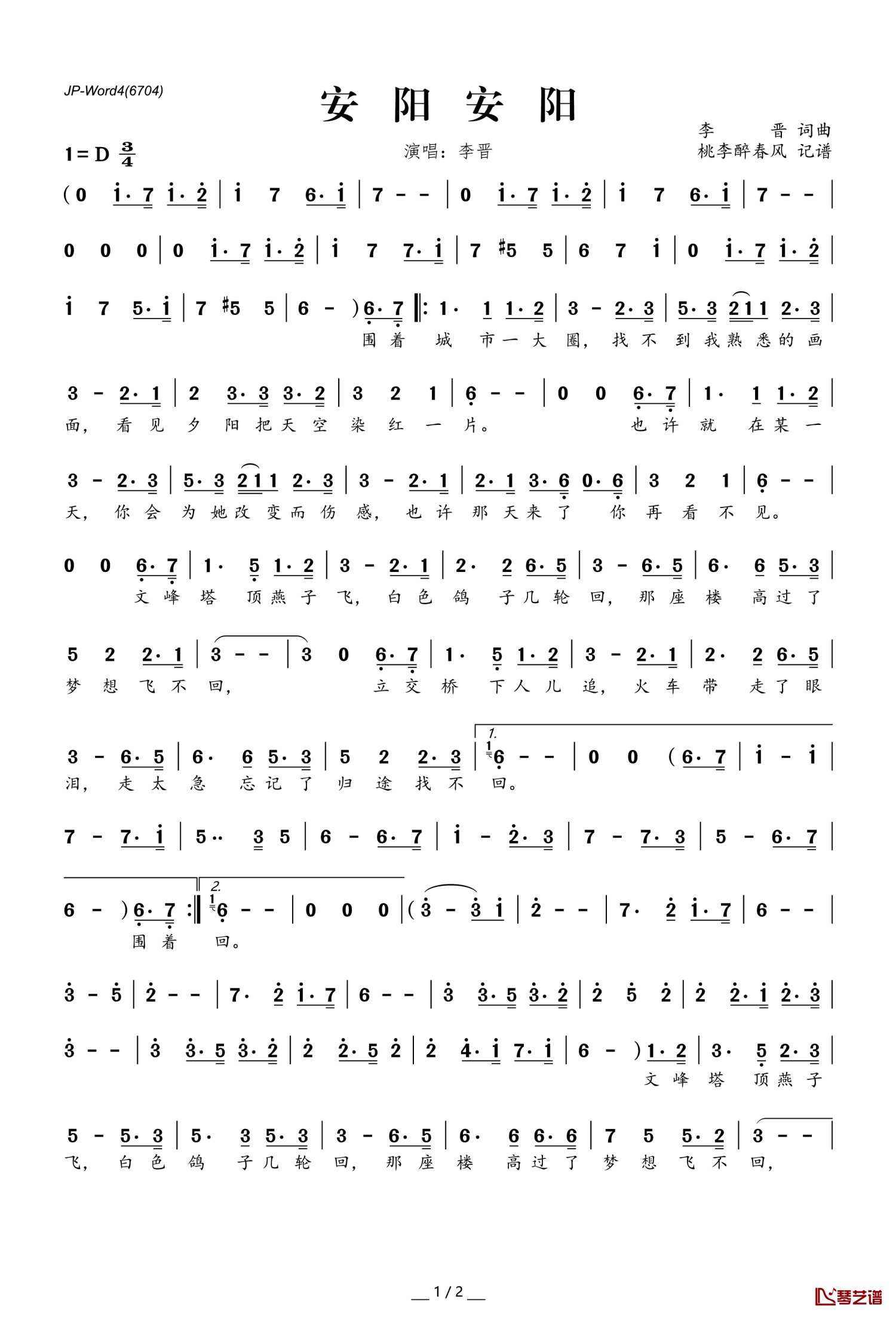 曲谱介绍: 李晋《​安阳安阳》歌词_简谱