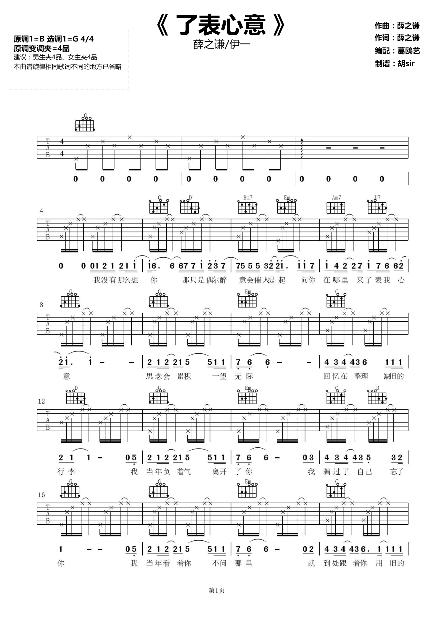 曲谱介绍: 了表心意吉他谱,薛之谦伊一演唱,原调B,选调G,建议变调夹夹四品。一首好听的《无限歌谣季》原创歌曲,了表心意六线谱,高清弹唱图片谱 《无限歌谣季》“青春无限”主题演唱会,薛之谦、伊一组成的“雷迪尬尬”组合以一首对唱歌曲《了表心意》回忆青春,用娓娓道来的对唱方式,唱出初心不变的真挚情感,唱出关于青春的爱与遗憾。