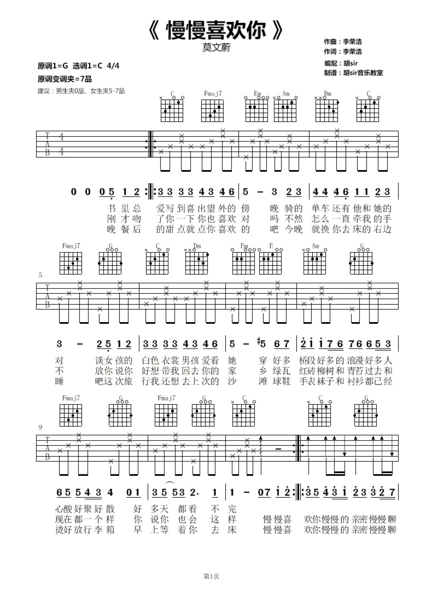 曲谱介绍: 原调G调 ,原变调夹夹7品;本谱选调C调,变调夹建议男生不夹,女生夹5-7品;都说喜欢是慢慢的一个过程,有时候明知道靠近你是慢性自杀,却仍疯狂的贪婪你的气息。爱情不是一个结果,而是一个,慢慢慢慢更爱你的过程。莫文蔚《慢慢喜欢你》吉他谱,高清C调版本,来自胡sir吉他编配分享。弹原调可将变调夹夹第七品,男生弹唱不用夹变调夹直接唱就可以了。