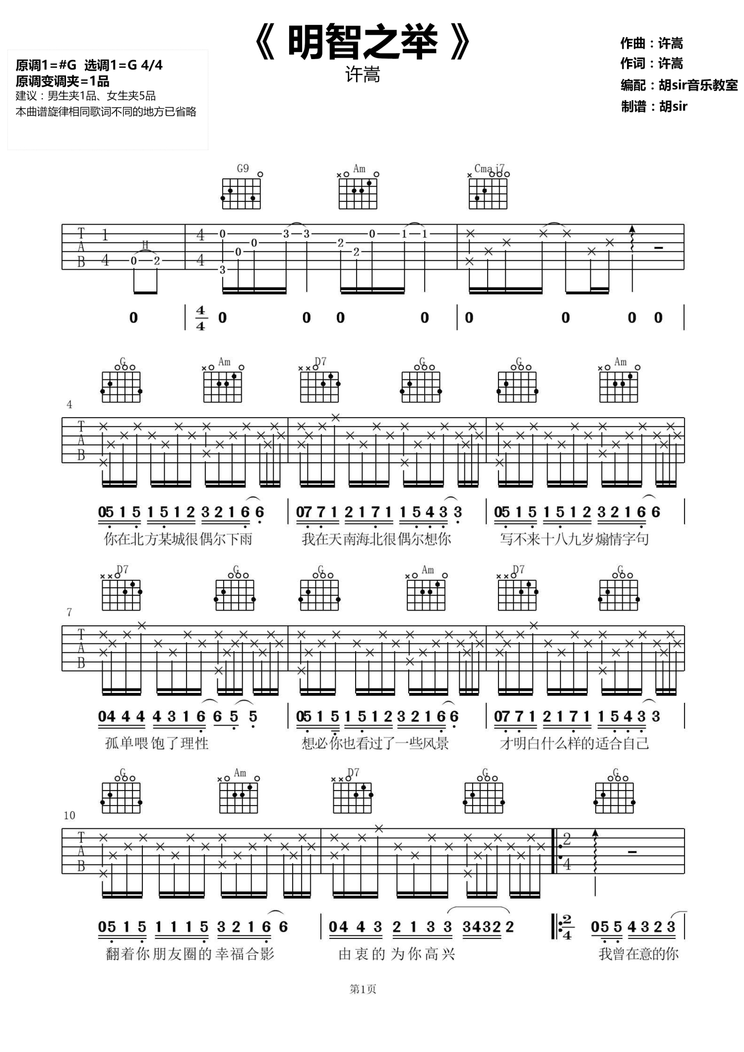 曲谱介绍: 许嵩独白式新歌《明智之举》吉他谱分享,本谱为G调六线谱,原调为升G,变调夹夹第一品即可。这首歌曲由许嵩作词作曲,浓郁的复古味道,节奏布鲁斯曲风不带半分愁苦痴缠,将一腔深情处理的不动声色-喜欢你是我的“明智之举”!