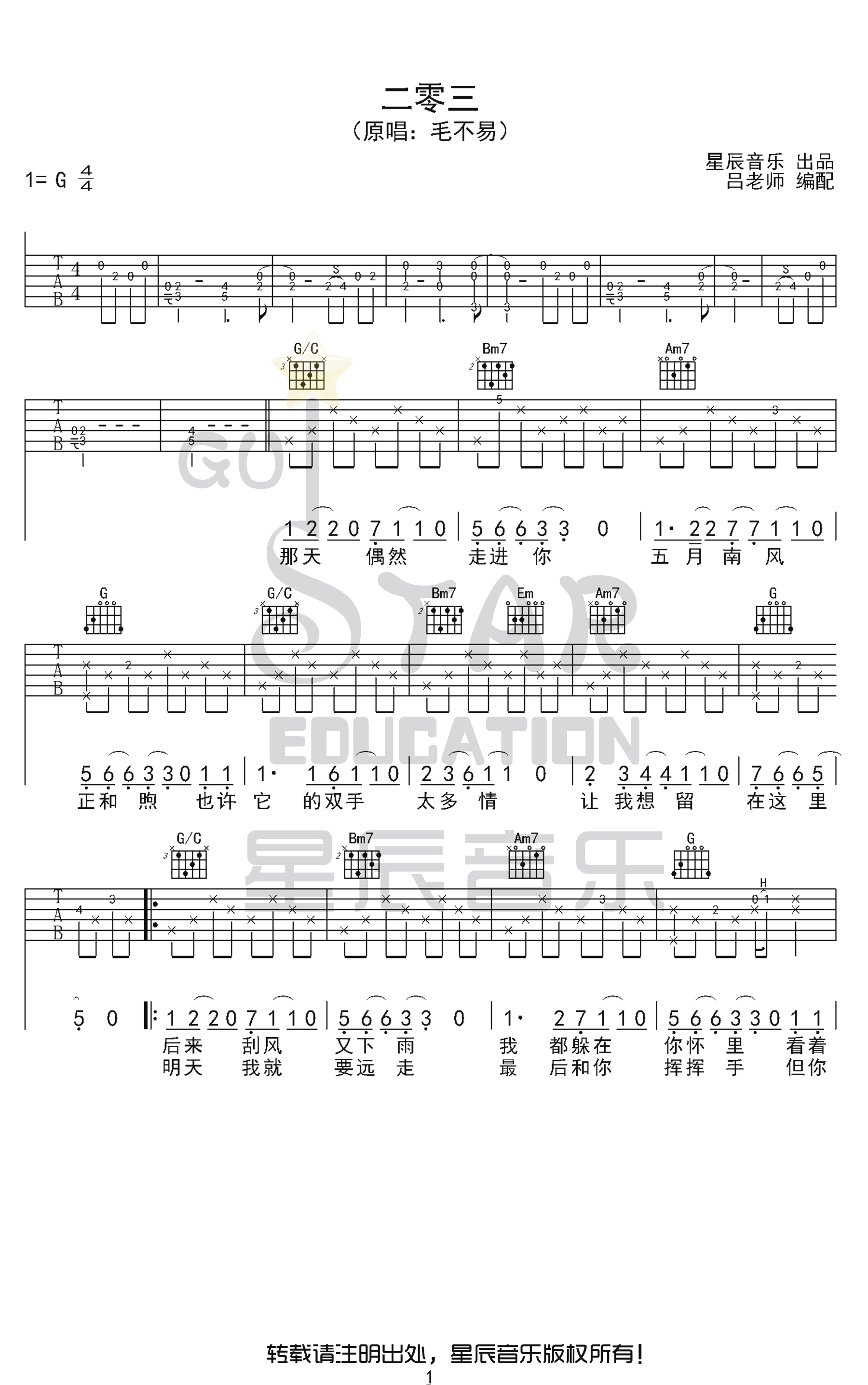 曲谱介绍: 《二零三》吉他谱,毛不易的一首老歌重新编曲演唱,收录在新专辑《小丑》当中。203吉他弹唱谱,高清图片六线谱,G调原版编配,星辰音乐出品,更新上传。
