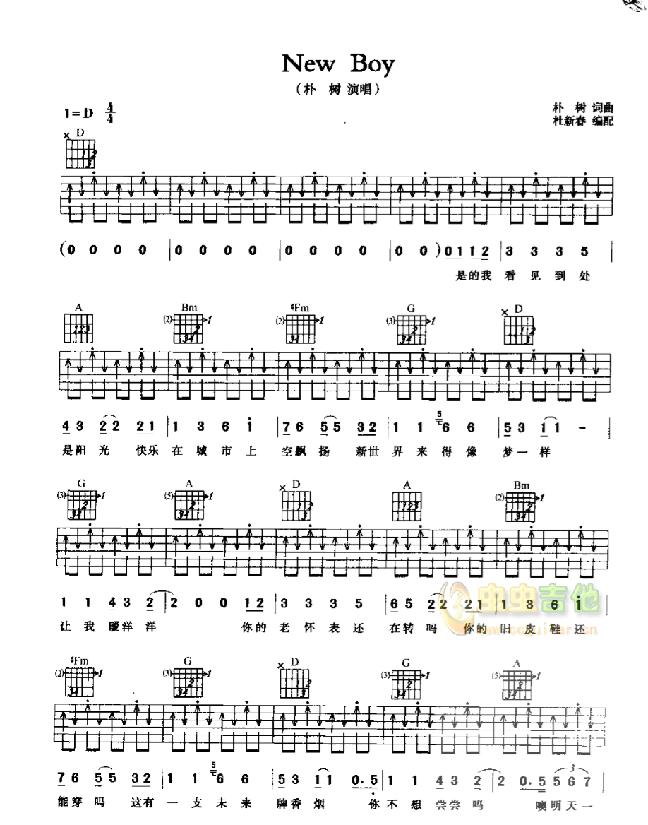 曲谱介绍:   《NewBoy》是朴树作词、作曲,张亚东编曲、制作歌曲。收录在朴树1999年发行的专辑《我去2000年》、和2003年发行的专辑《我去2000年(珍藏版)》中,这首歌曲是朴树摇滚音乐代表作。   2017年,朴树对《NewBoy》重新填词、编曲,创作了《Foreveryoung》,收录在专辑《猎户星座》中。