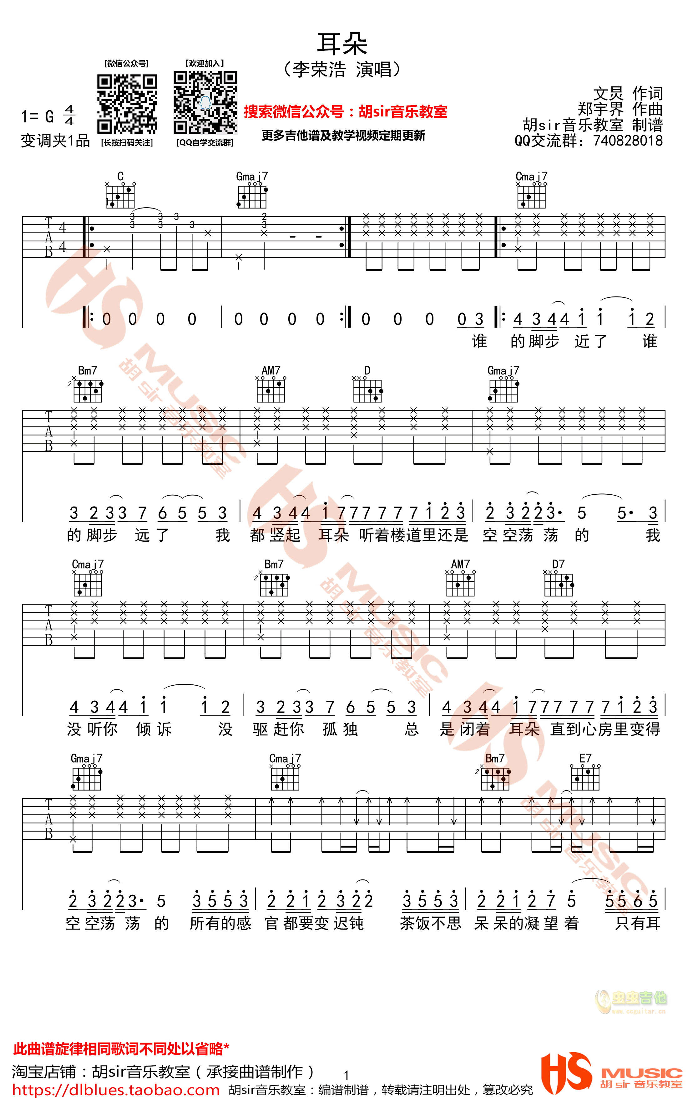 曲谱介绍:   《耳朵》是由文炅作词,郑宇界作曲[1],李荣浩编曲并演唱的歌曲,收录于李荣浩2018年10月17日发行的同名专辑《耳朵》中。