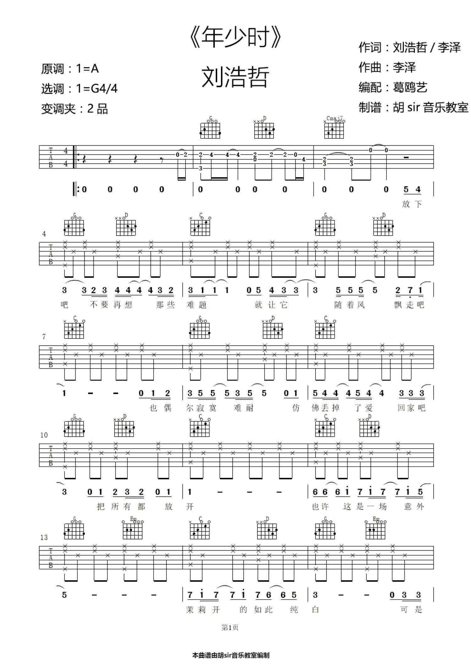 • 年少时吉他谱 - 刘浩哲 - G调吉他弹唱谱第1张