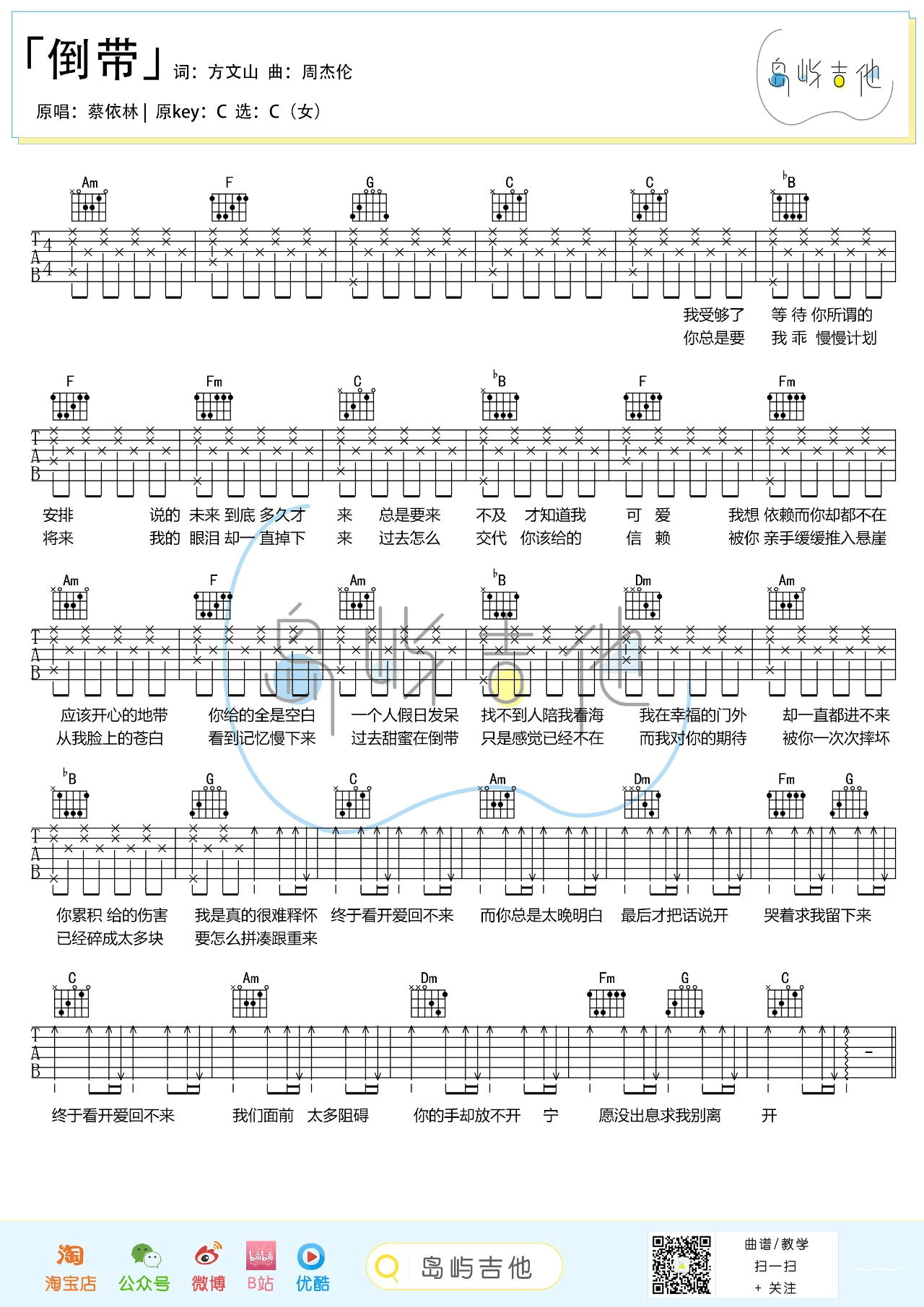 曲谱介绍: 《倒带》吉他谱,蔡依林的一首代表作品,C调弹唱谱,和弦图片谱+六线谱,岛屿吉他编配出品,整理上传。 这首歌是旧爱周杰伦写给蔡依林的,曾经在多次演唱会上戳中歌迷泪点。