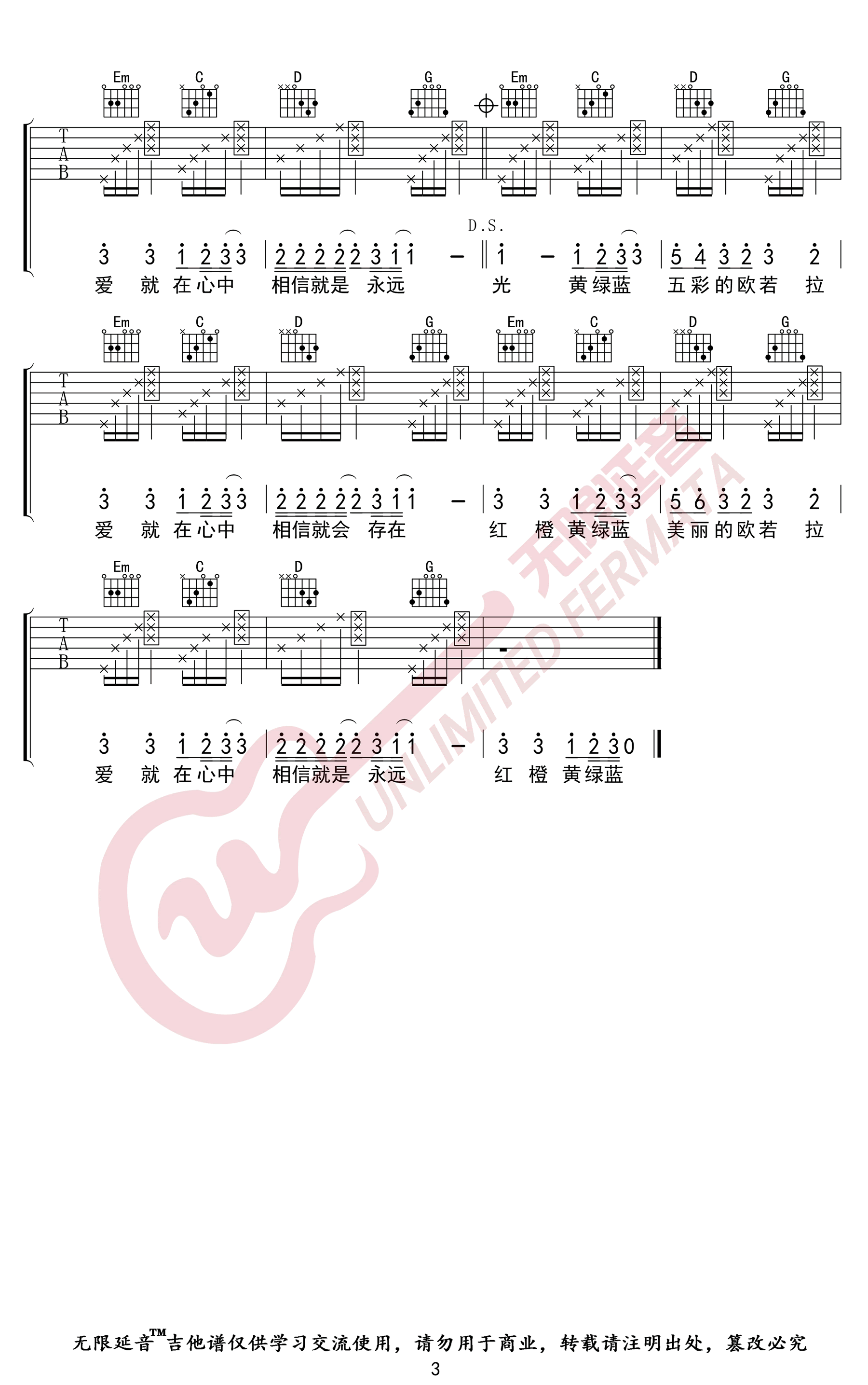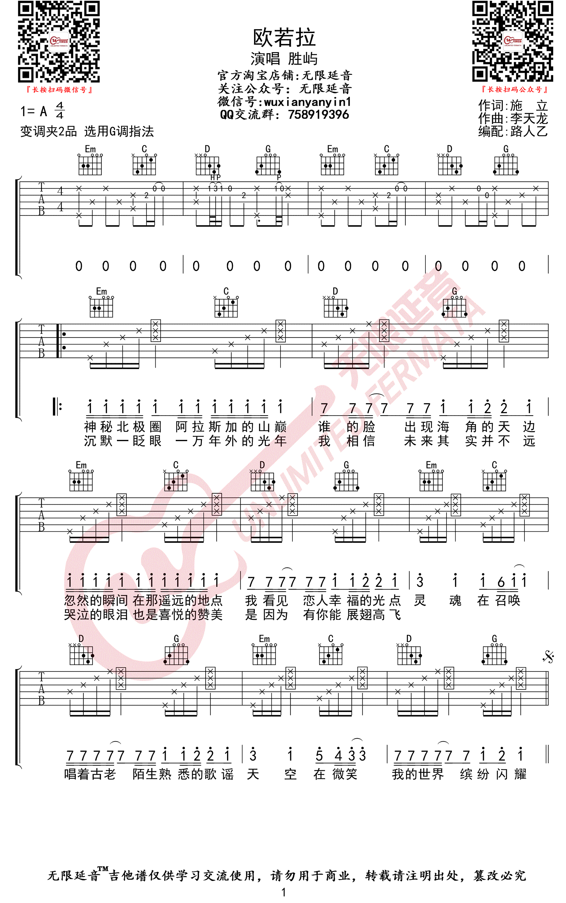 曲谱介绍: 《欧若拉》吉他谱,胜屿翻唱,张韶涵的一首经典歌曲,欧若拉吉他六线谱,原调A,变调夹夹第二品,选用G调指法,三张高清弹唱图片谱,无限延音出品,整理上传。 阳光老歌,重温旧情,让人单曲循环的精彩演绎,带我们在饱满且真挚动听的情感歌声里,去追逐那幸福的极光!