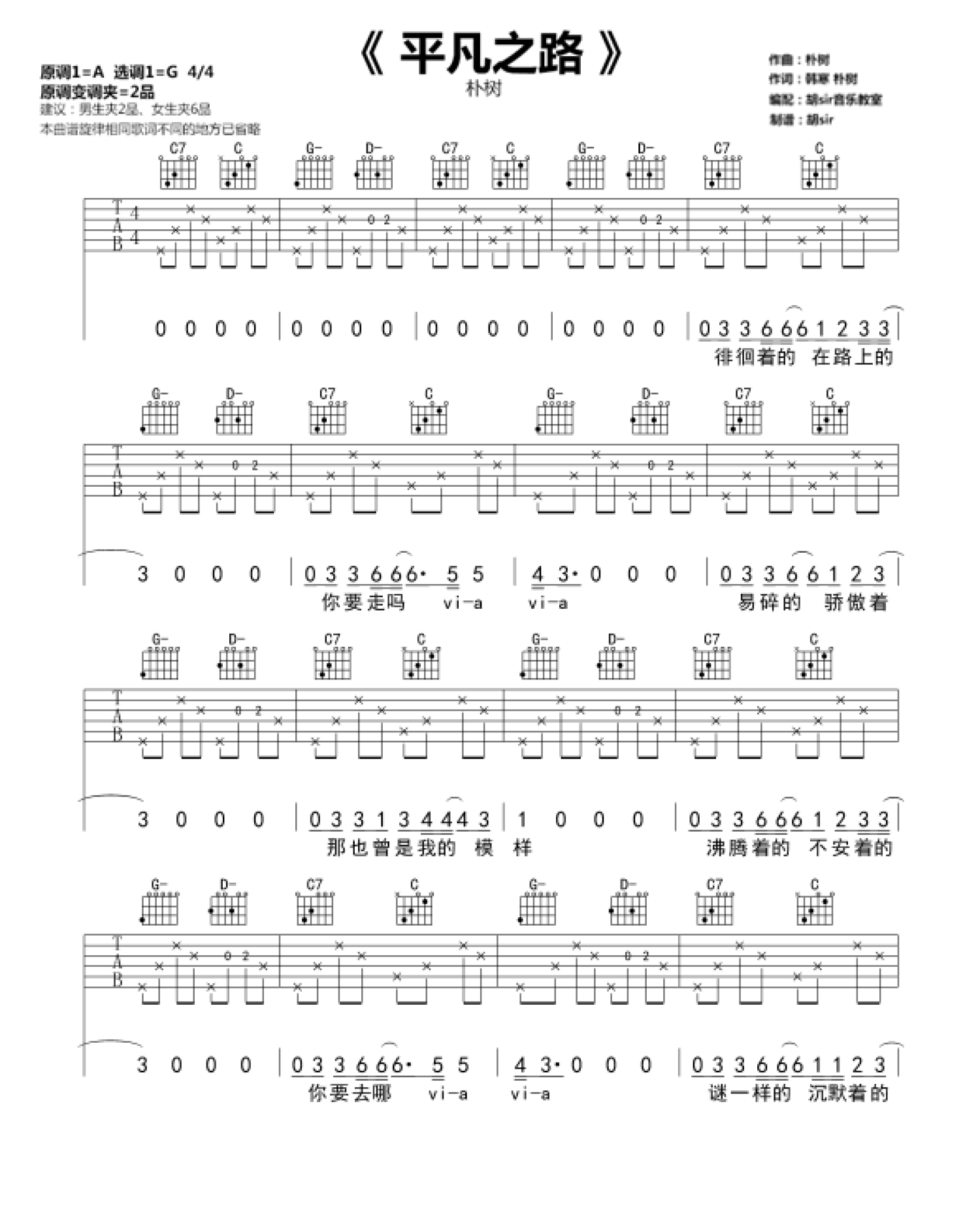 曲谱介绍: 原调A;变调夹夹2品;本谱选调: G调;建议男生夹2品,女生夹6品;《平凡之路》是朴树演唱的歌曲,为韩寒执导电影《后会无期》的主题曲。该歌曲由朴树作曲,朴树、韩寒作词,收录于同名EP。随着《平凡之路》的发行,沉寂十年的歌手朴树正式复出。2014年11月22日《平凡之路》获得第51届台湾电影金马奖最佳原创电影歌曲。