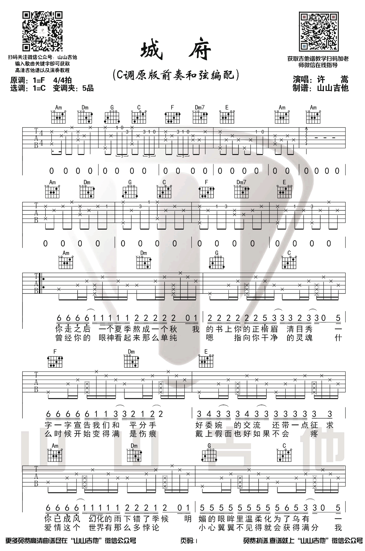 曲谱介绍: 《城府》吉他谱,许嵩的一首经典老歌,城府六线谱,原调F,选用了C调指法,带原版前奏和弦编配,变调夹夹五品。感谢山山吉他编配制谱,整理上传分享。 《城府》让我们知道了那个带黑框眼镜,温文尔雅、不善言谈的许嵩。歌词后面有浓得化不开的伤悲,关涉我们那曾经美好,但又刻骨铭心的伤痛爱情故事。